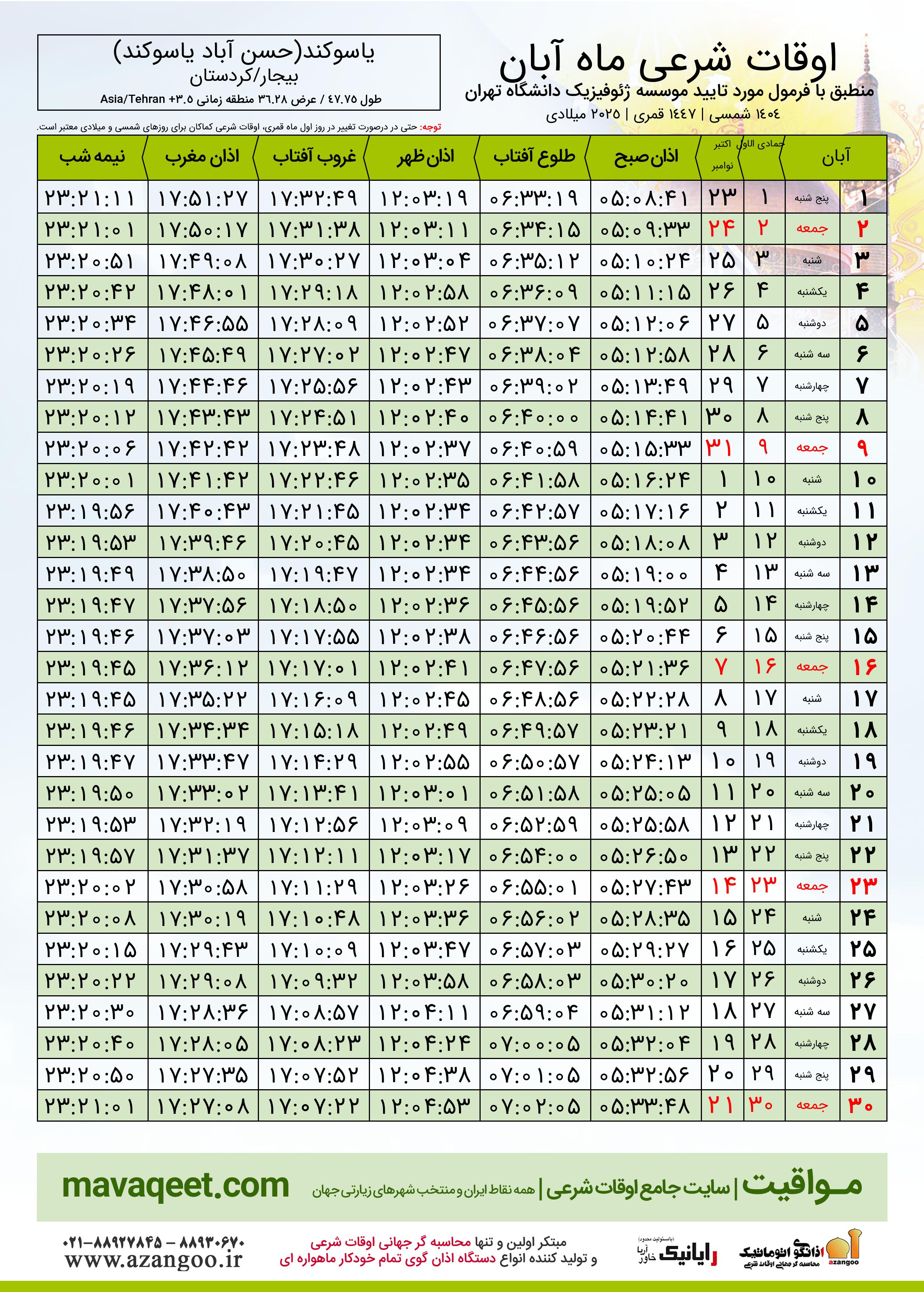 اوقات شرعی آبان ١٤٠٤ شمسی شهر یاسوکند(حسن آباد یاسوکند)