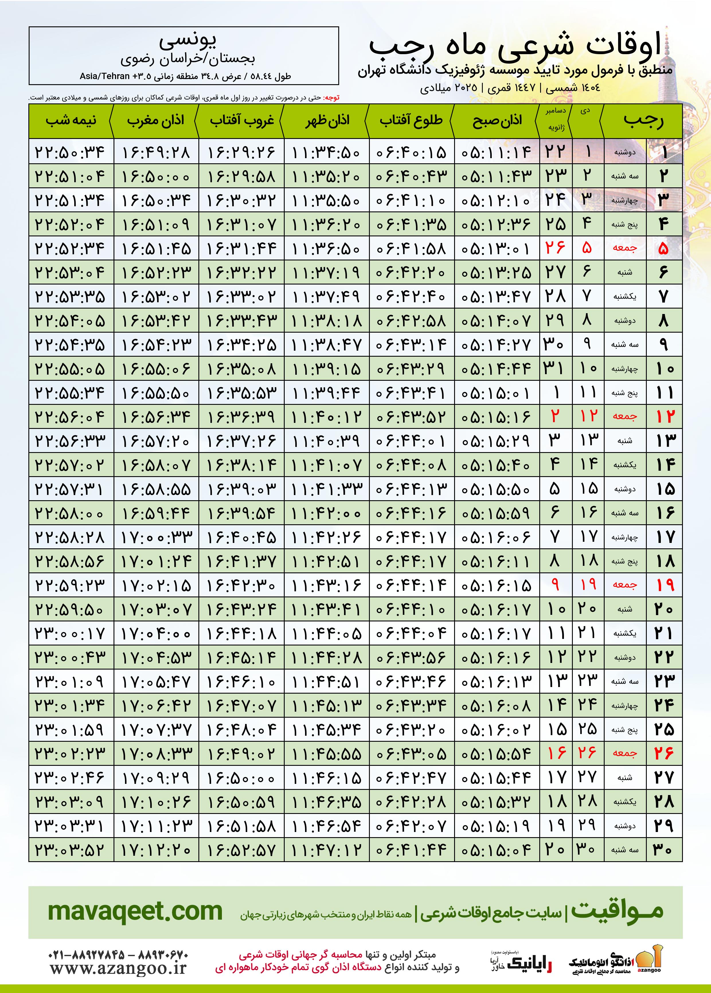 اوقات شرعی ماه رجب ١٤٤٧ هـ.ق شهر یونسی بر