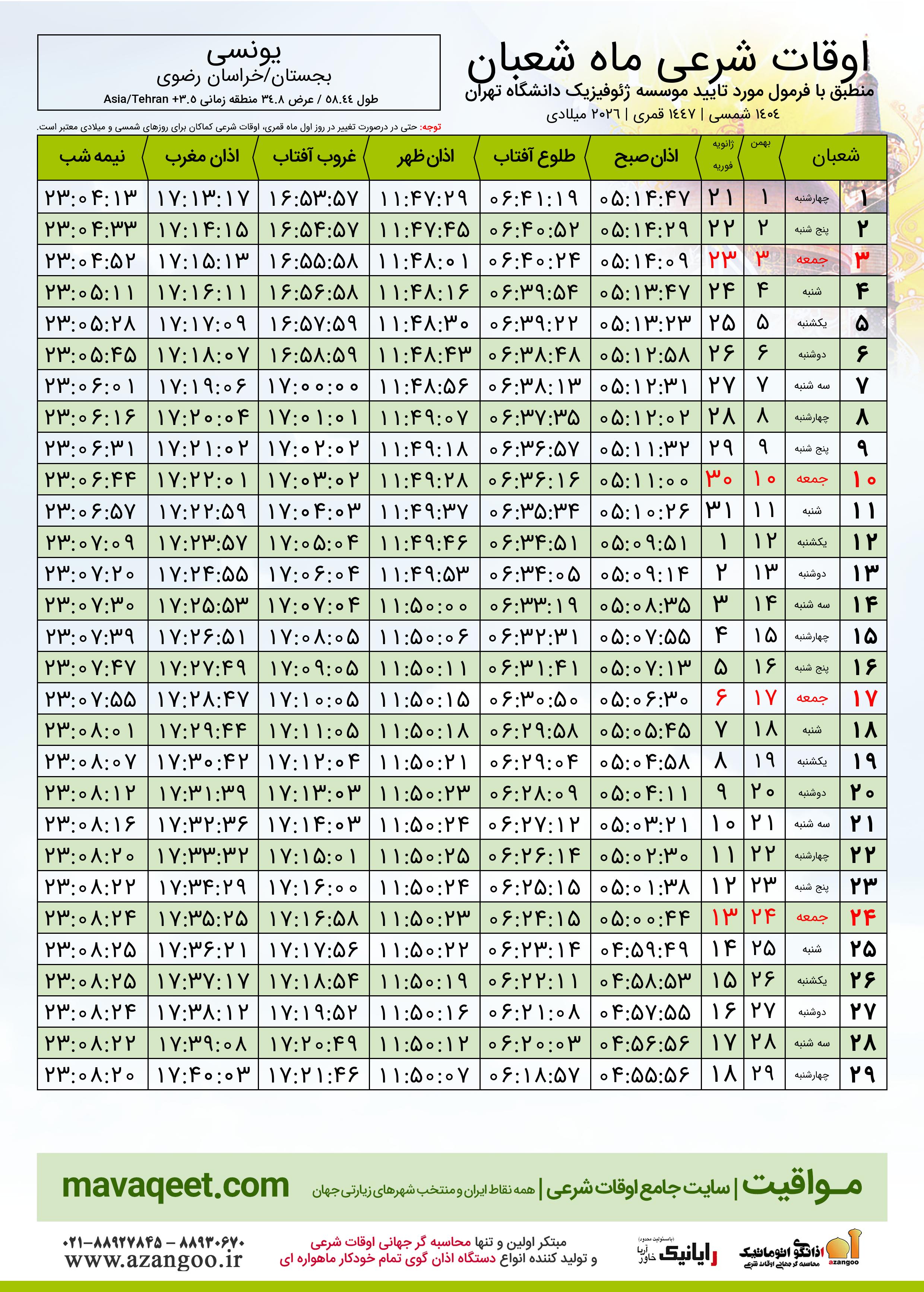 اوقات شرعی شعبان ١٤٤٧ قمری شهر یونسی