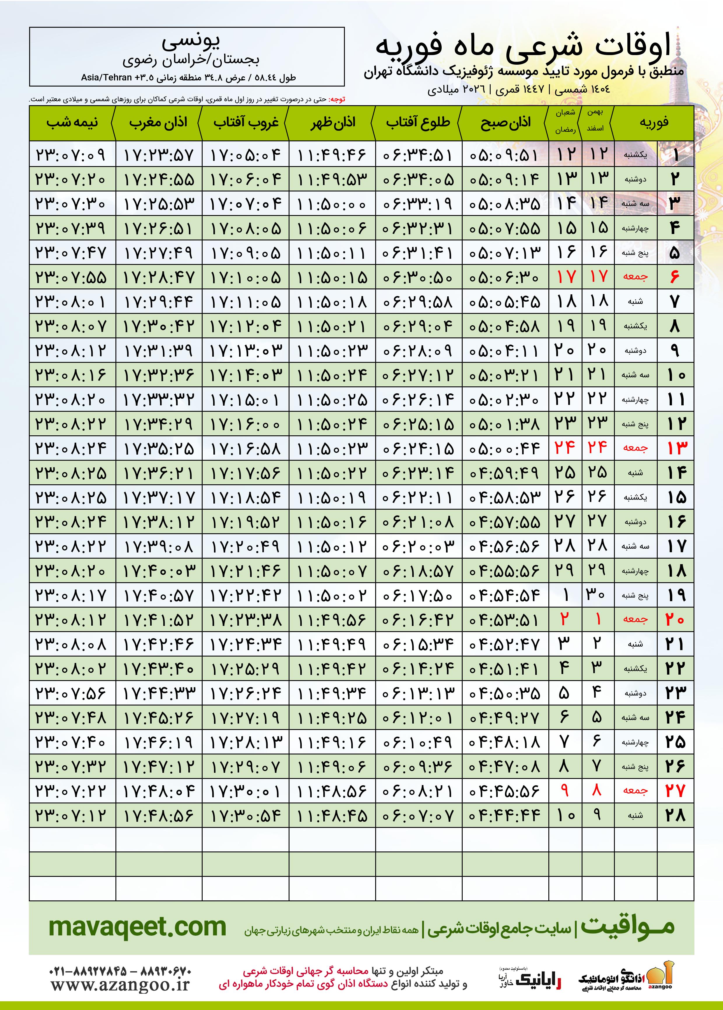 جدول اوقات شرعی ماه رمضان شهر یونسی ٠٤ - ١٤٠٤ شمسی | ٢٠٢٦ میلادی | ١٤٤٧ قمری