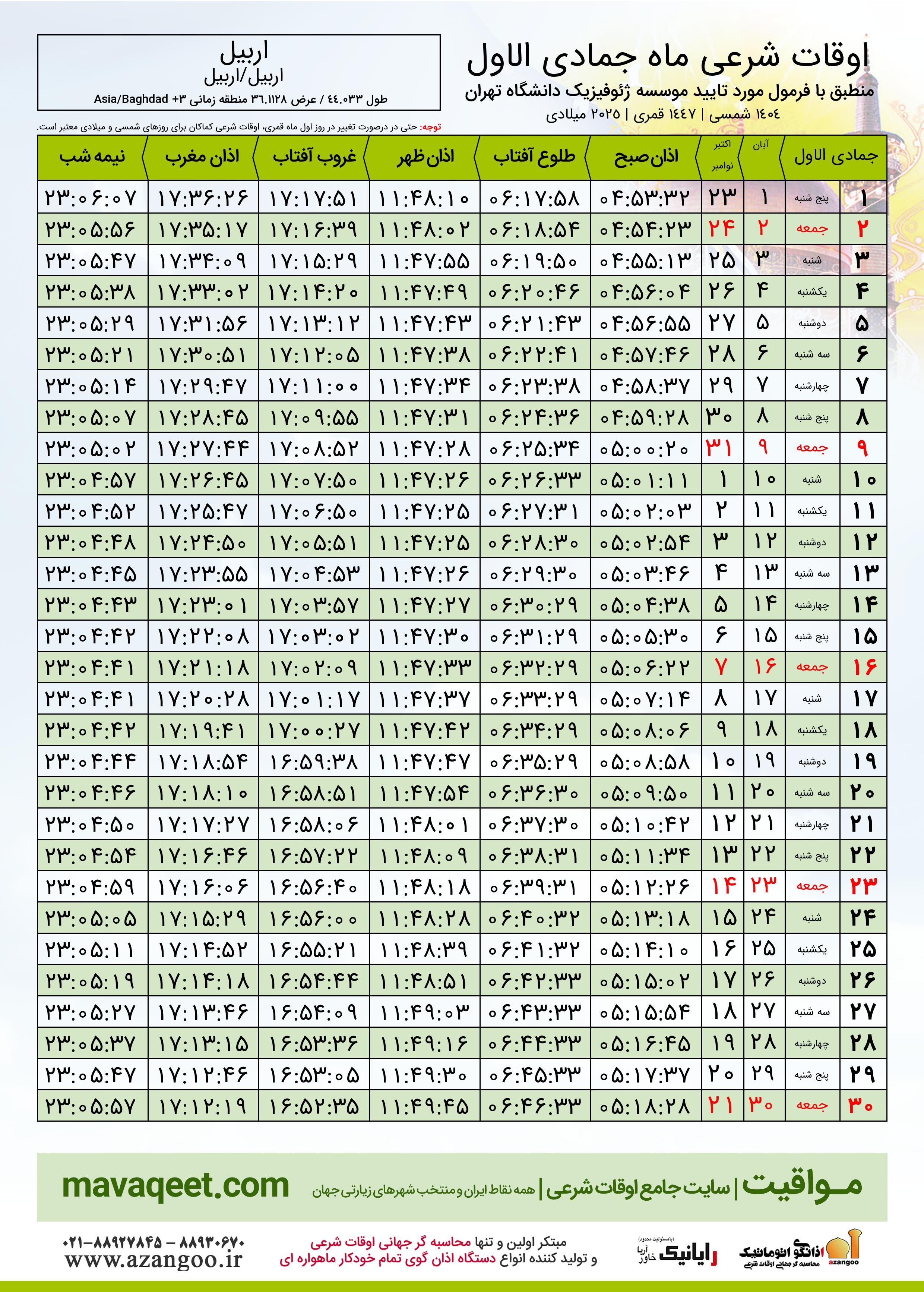 جدول اوقات شرعی جمادی الاول ١٤٤٧ قمری شهر اربیل