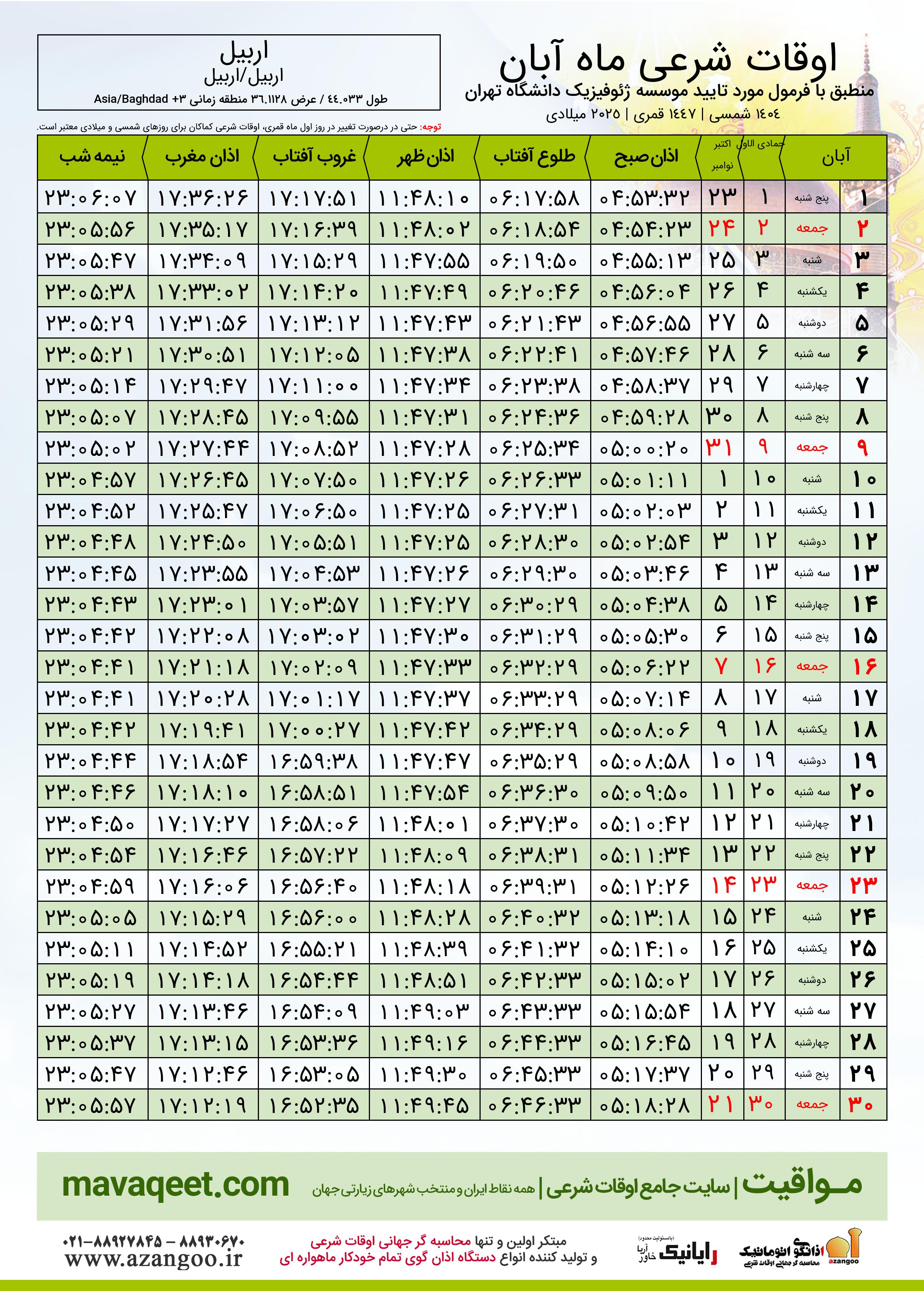 جدول اوقات شرعی آبان ١٤٠٤ شمسی شهر اربیل