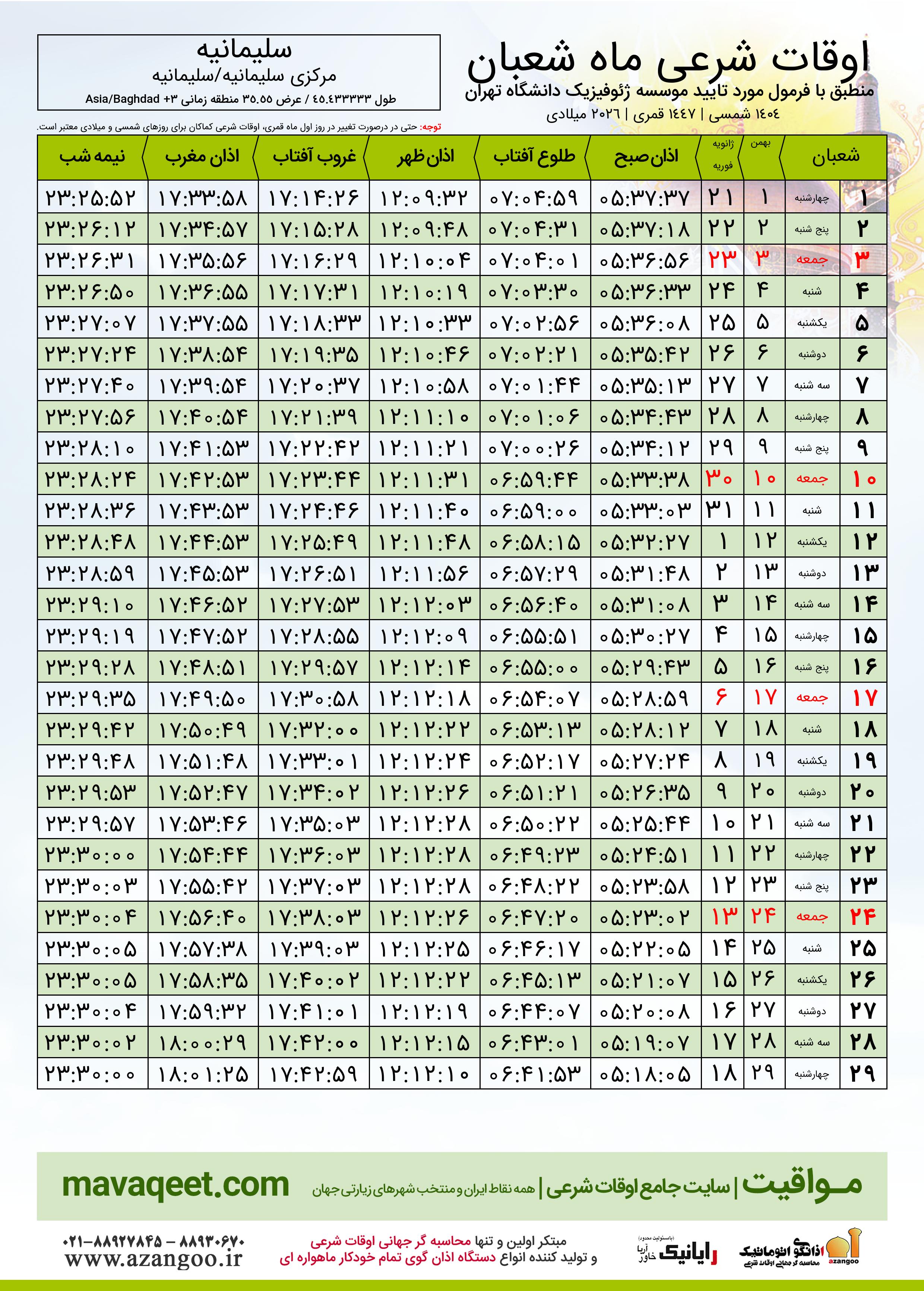 اوقات شرعی ماه شعبان ١٤٤٧ هـ.ق شهر سلیمانیه بر