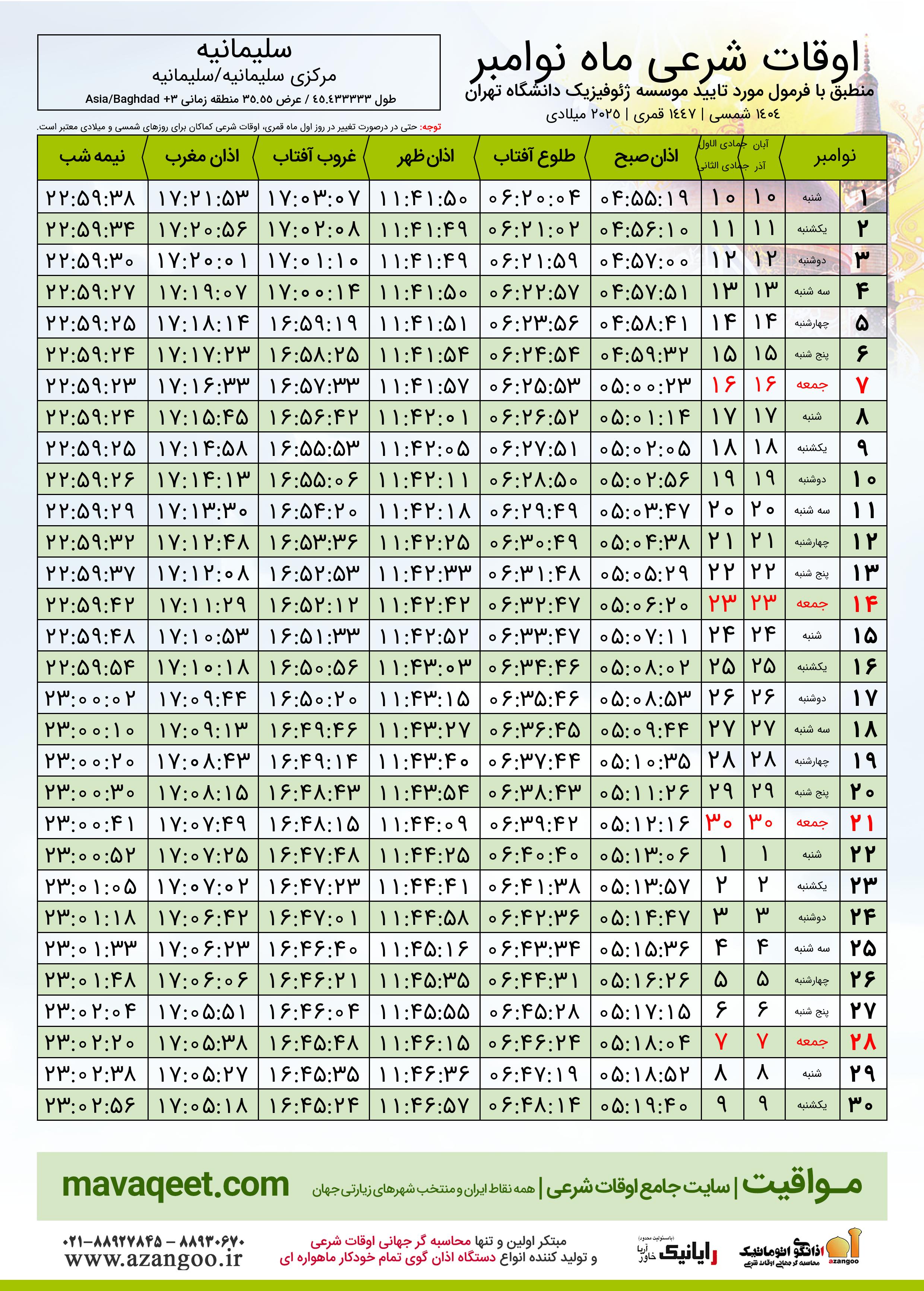 دانلود اوقات شرعی نوامبر ٢٠٢٥ شهر سلیمانیه