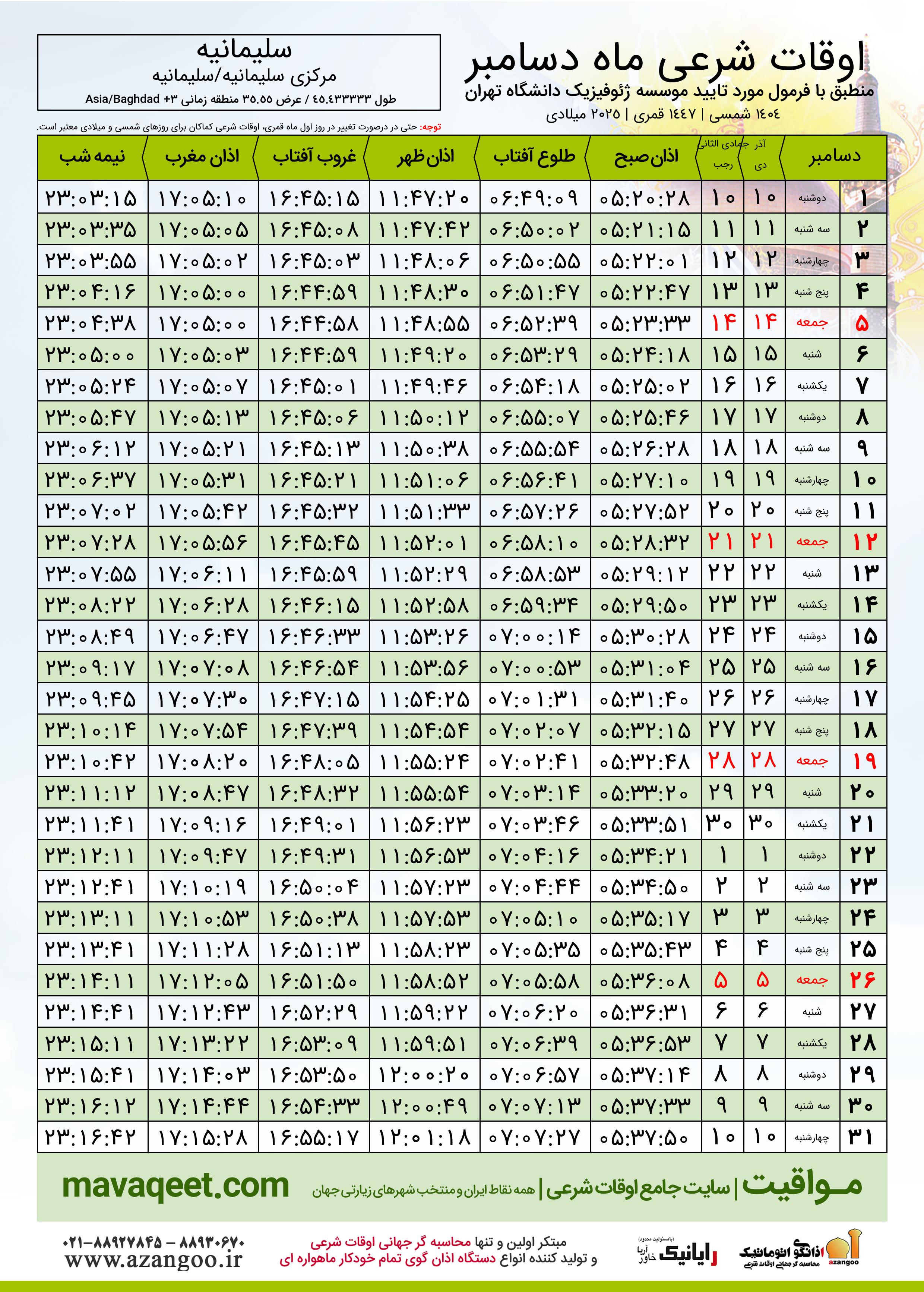 جدول اوقات شرعی دسامبر ٢٠٢٥ میلادی شهر سلیمانیه
