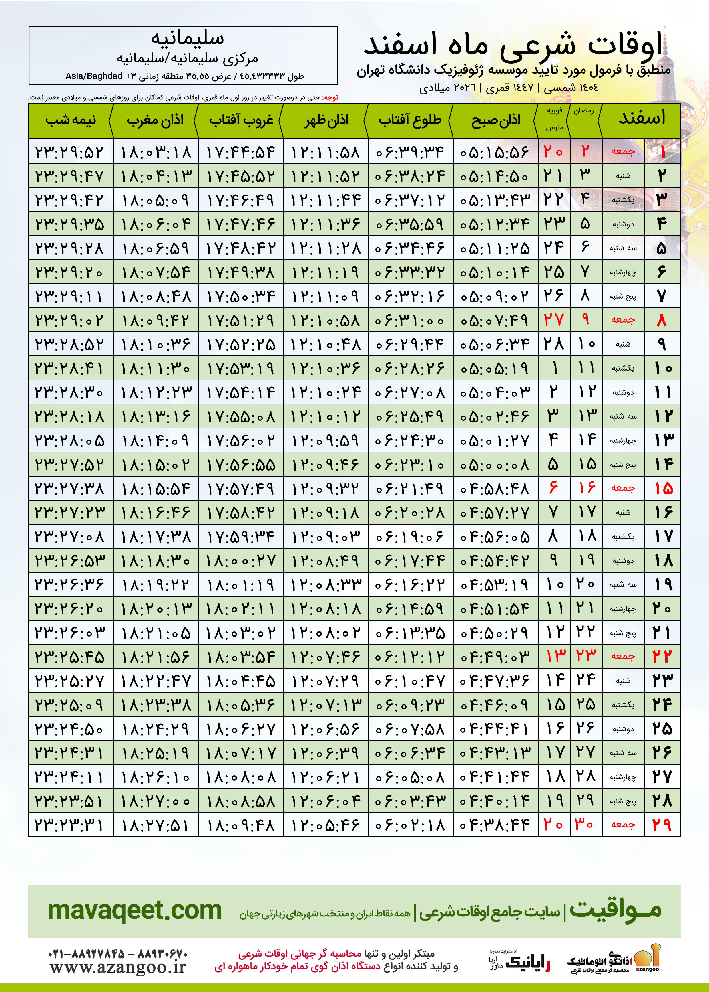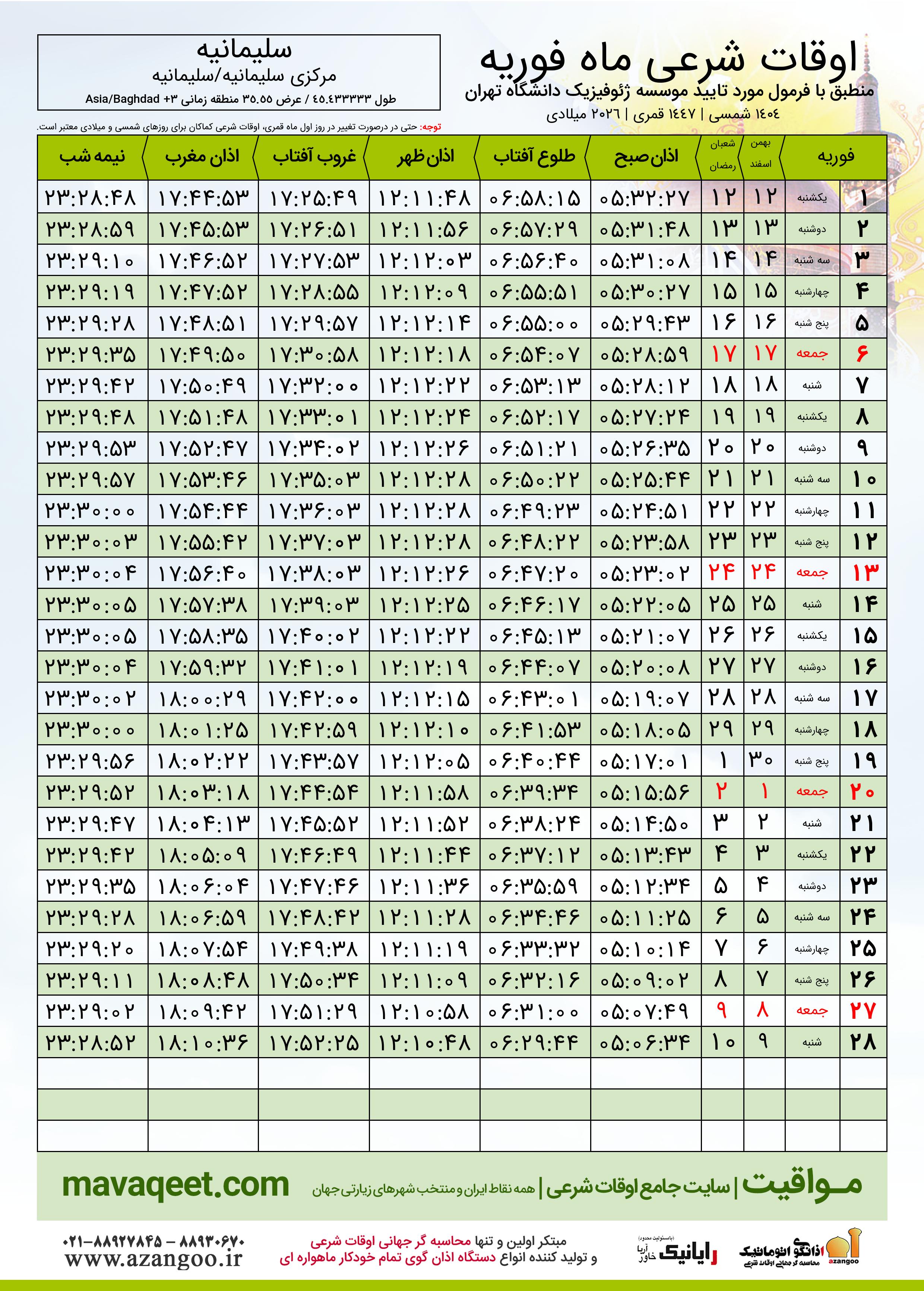 اوقات شرعی ماه رمضان شهر سلیمانیه ١٤٠٤ - ٠٤ شمسی | ٢٠٢٦ میلادی