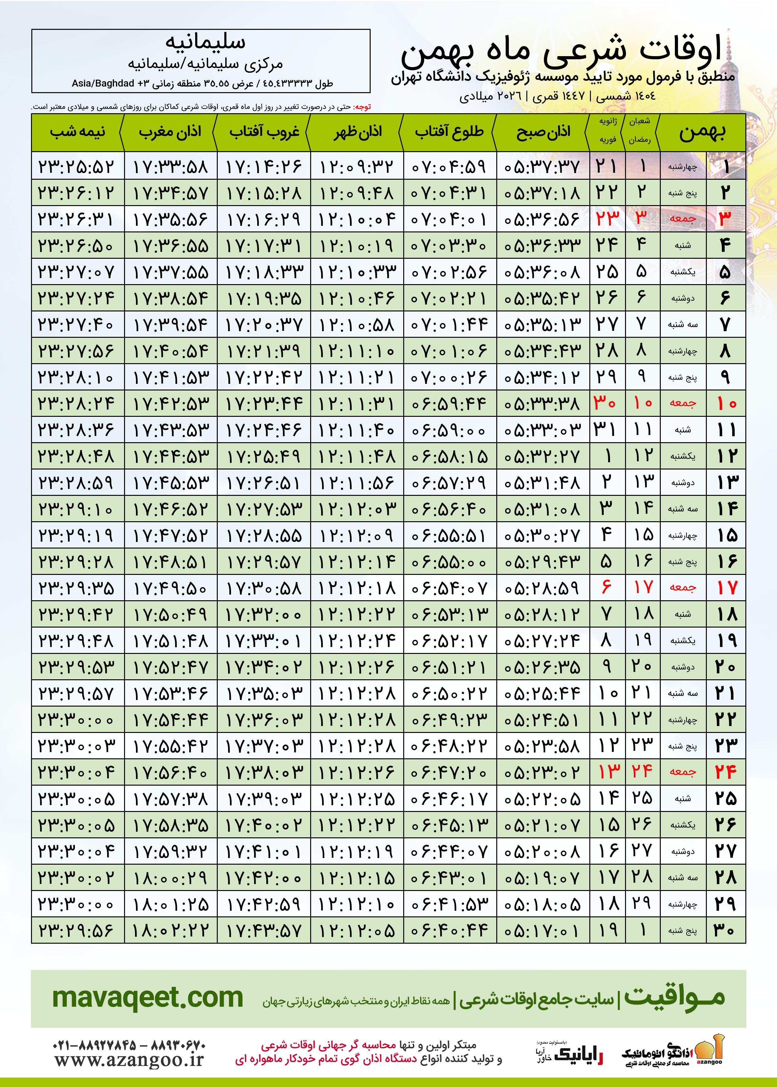 دانلود اوقات شرعی بهمن ٠٤ - ١٤٠٤ شهر سلیمانیه