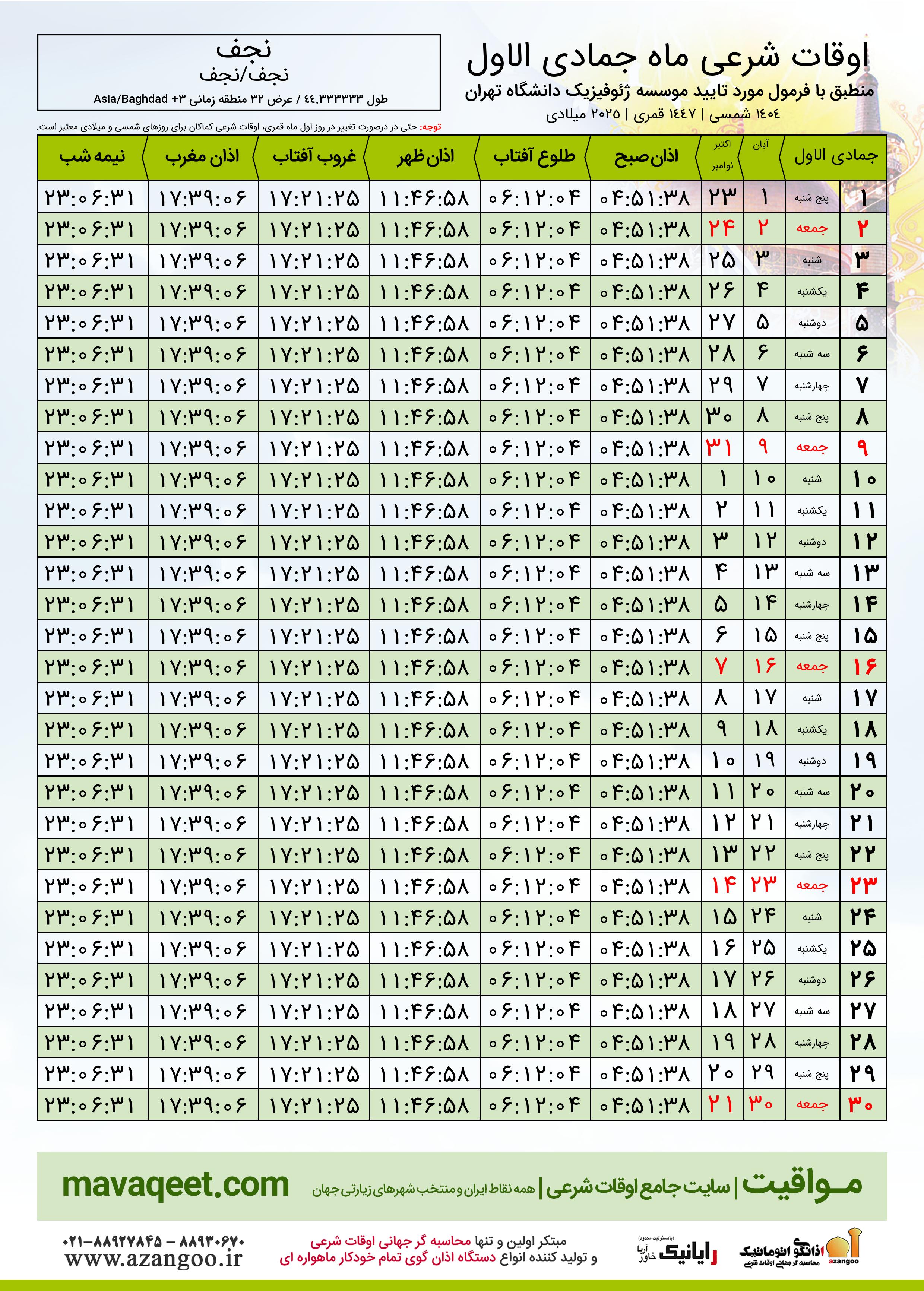 جدول اوقات شرعی جمادی الاول ١٤٤٧ قمری شهر نجف