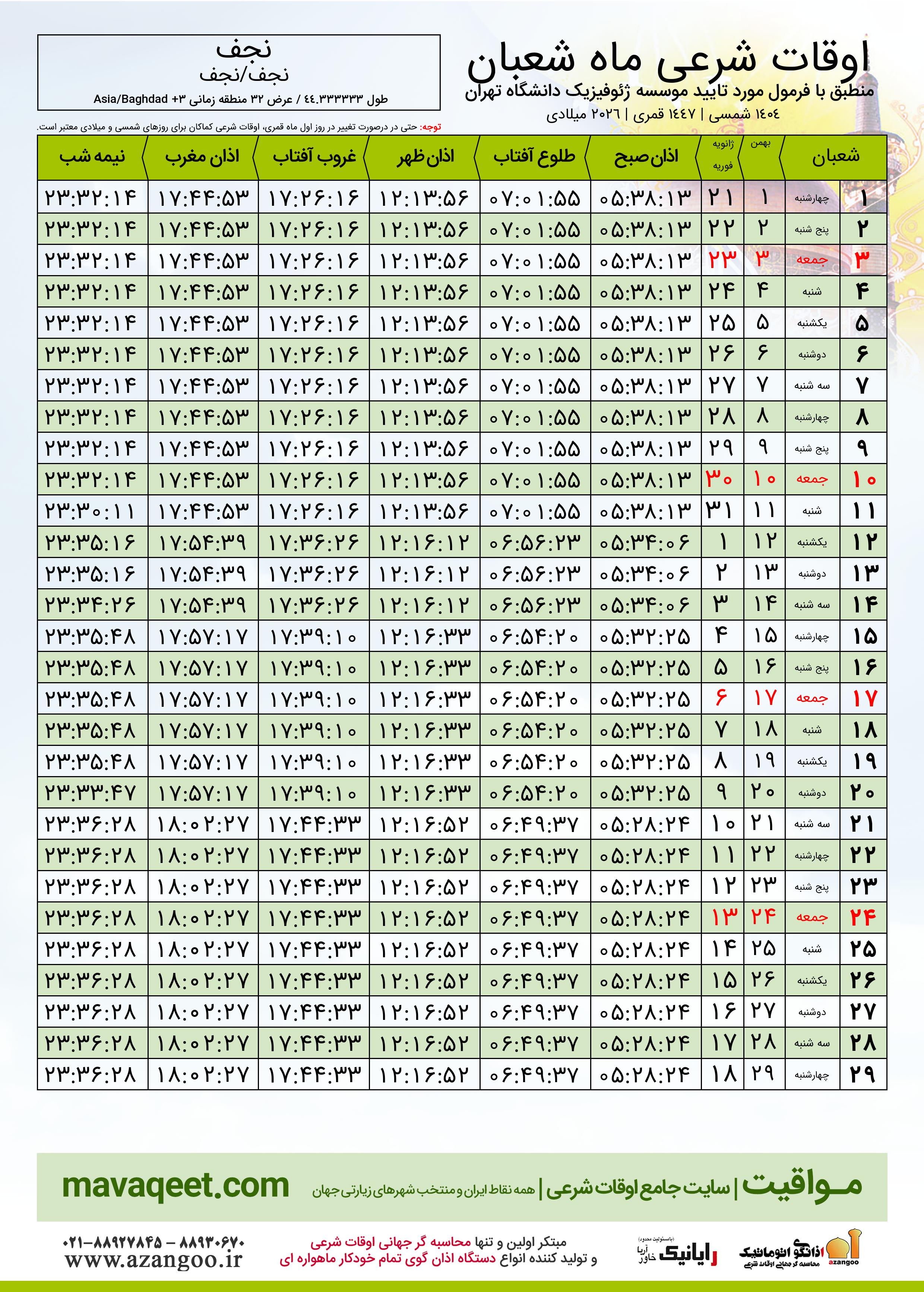 اوقات شرعی ماه شعبان ١٤٤٧ هـ.ق شهر نجف بر