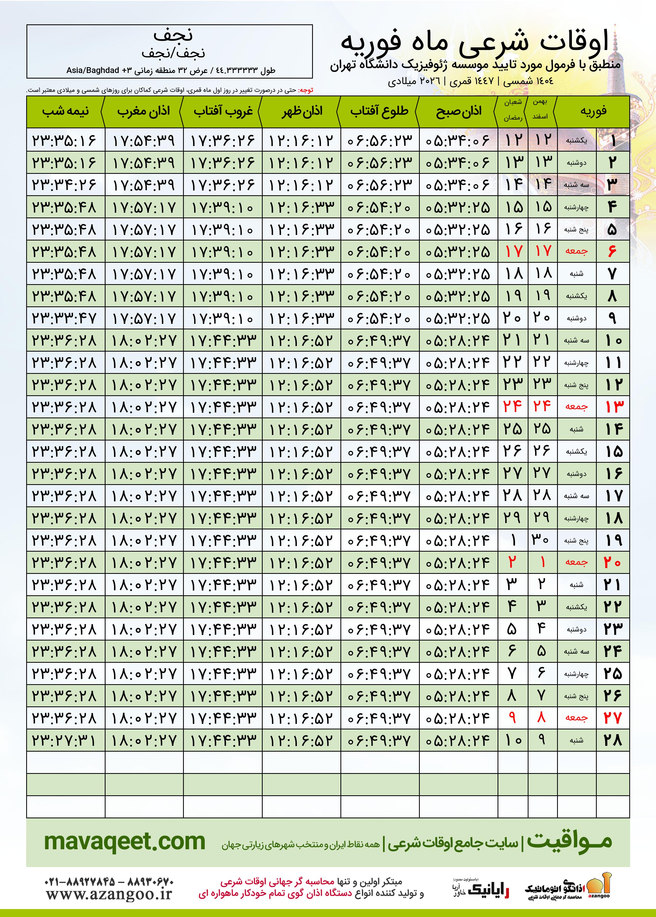 جدول اوقات شرعی فوریه ٢٠٢٦ میلادی شهر نجف