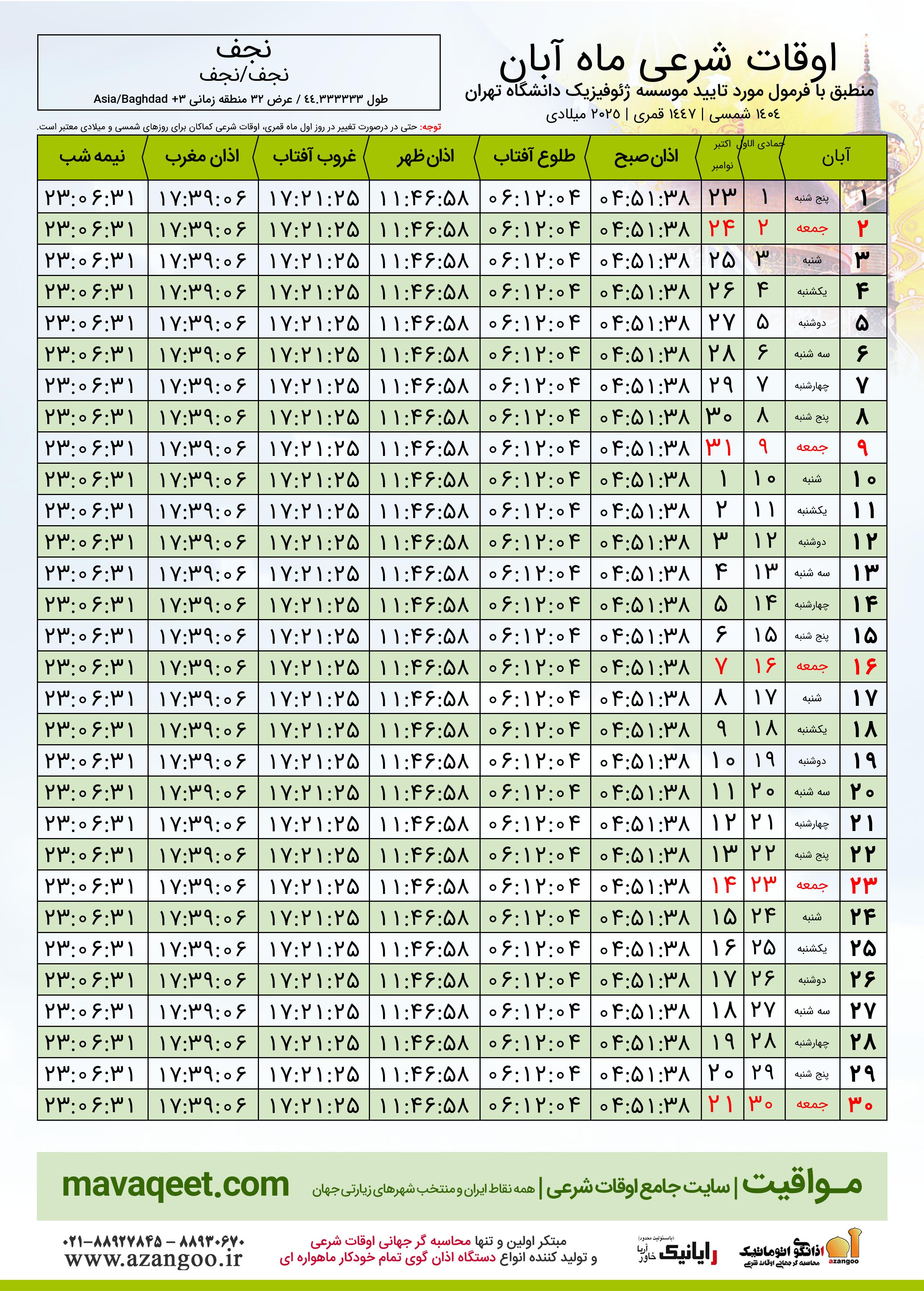 جدول اوقات شرعی آبان ١٤٠٤ شمسی شهر نجف