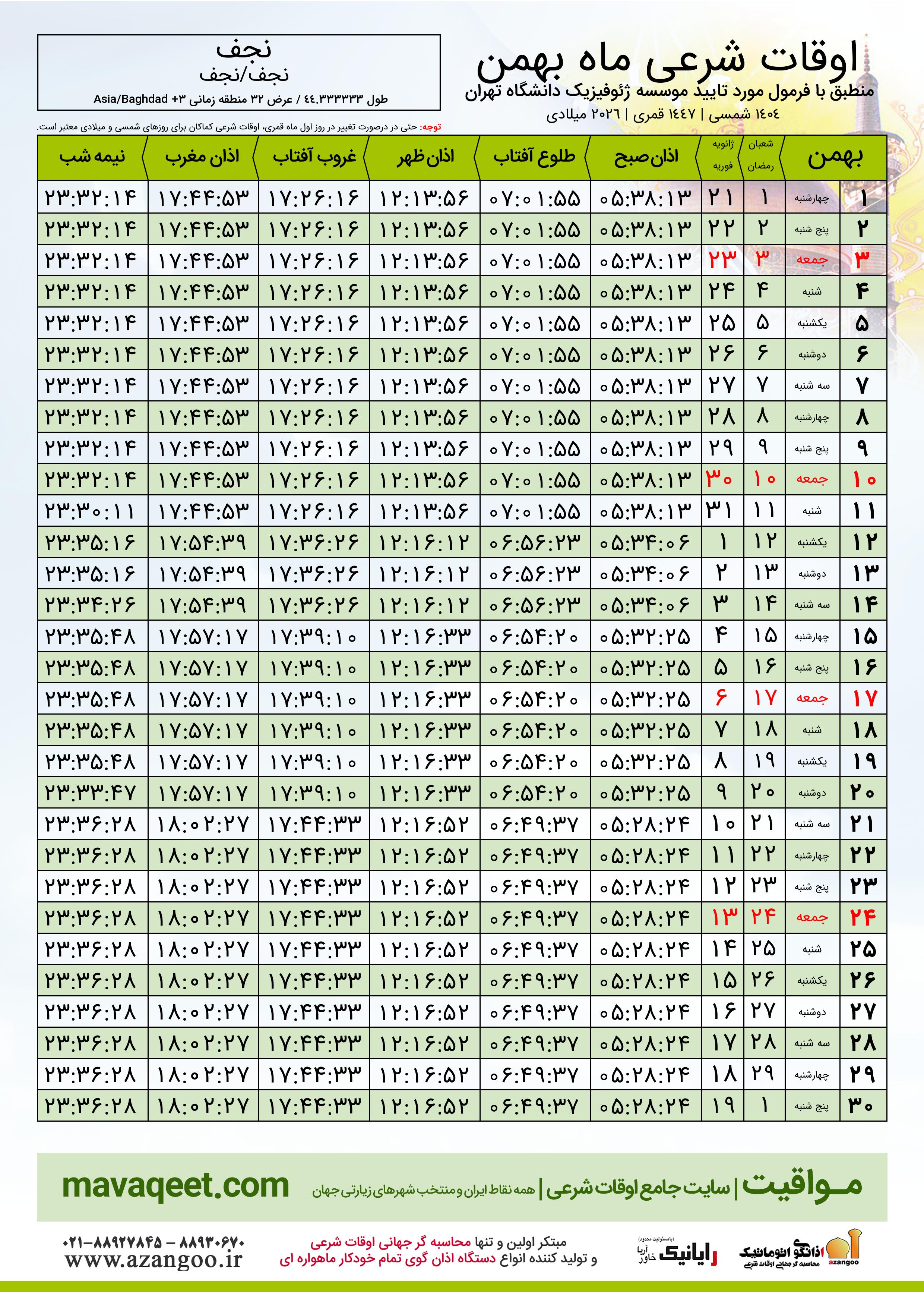 دانلود اوقات شرعی بهمن ٠٤ - ١٤٠٤ شهر نجف