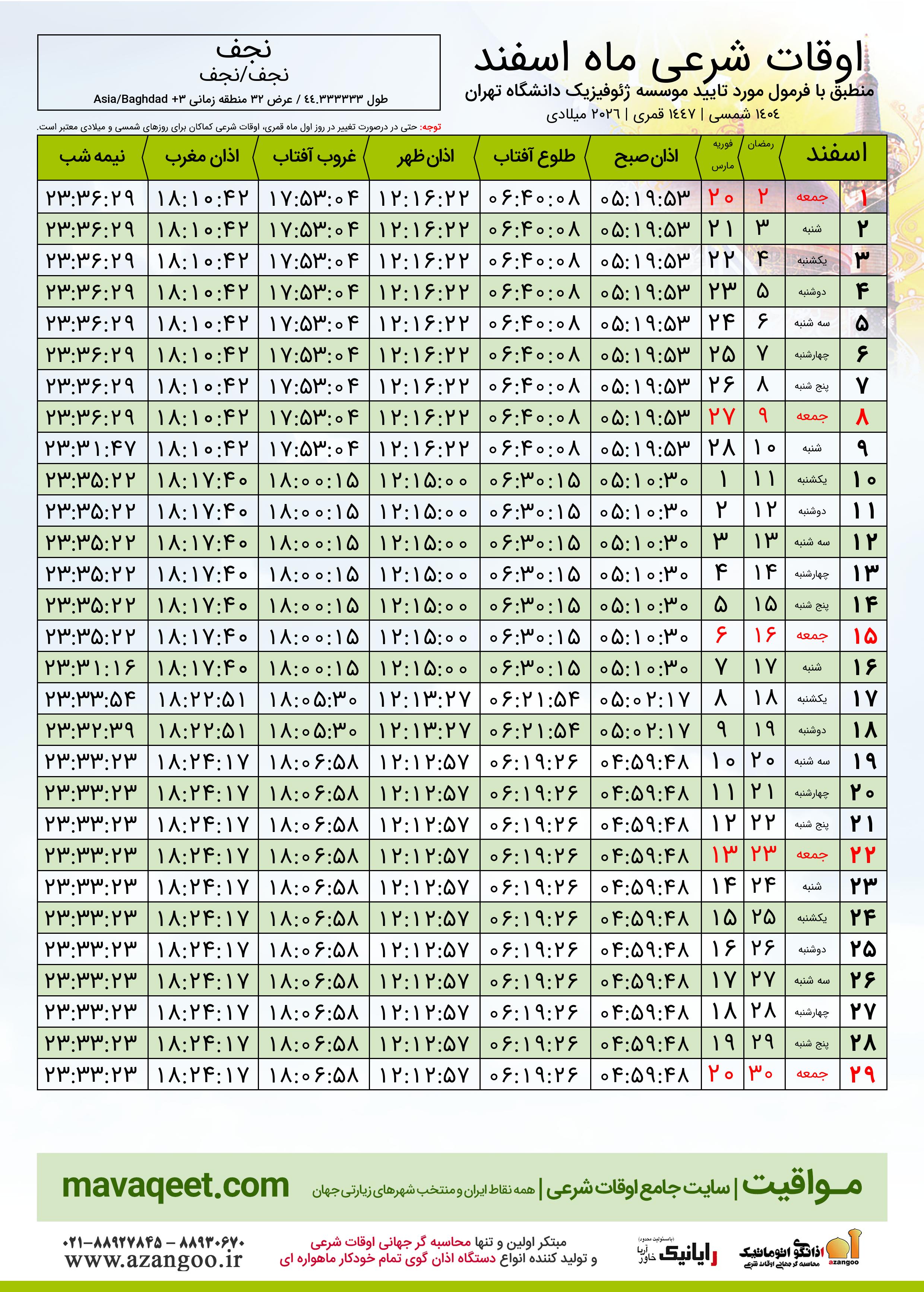 اوقات شرعی ماه رمضان شهر نجف ١٤٠٤ - ٠٤ شمسی | ٢٠٢٦ میلادی