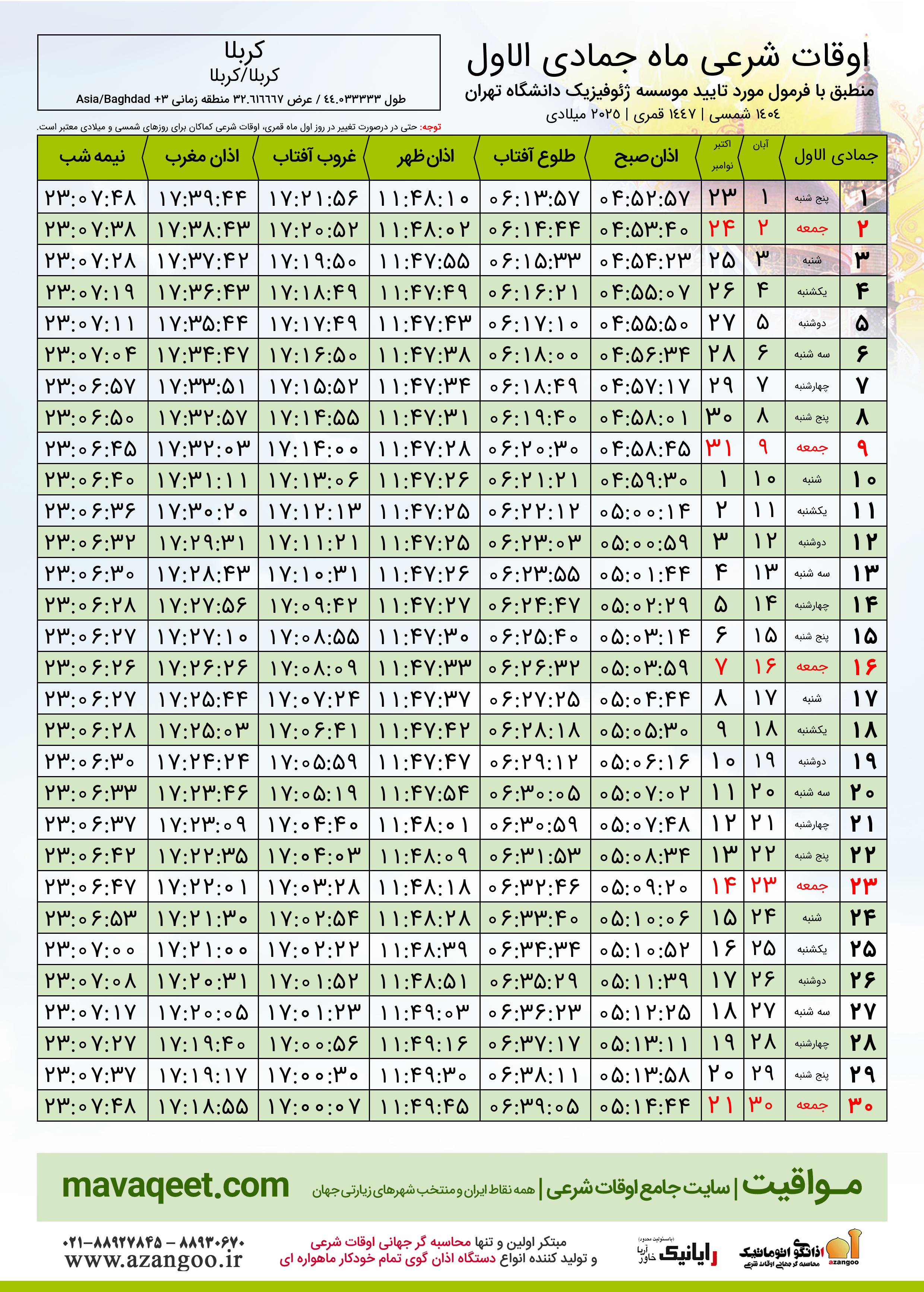 اوقات شرعی ماه جمادی الاول ١٤٤٧ هـ.ق شهر کربلا بر