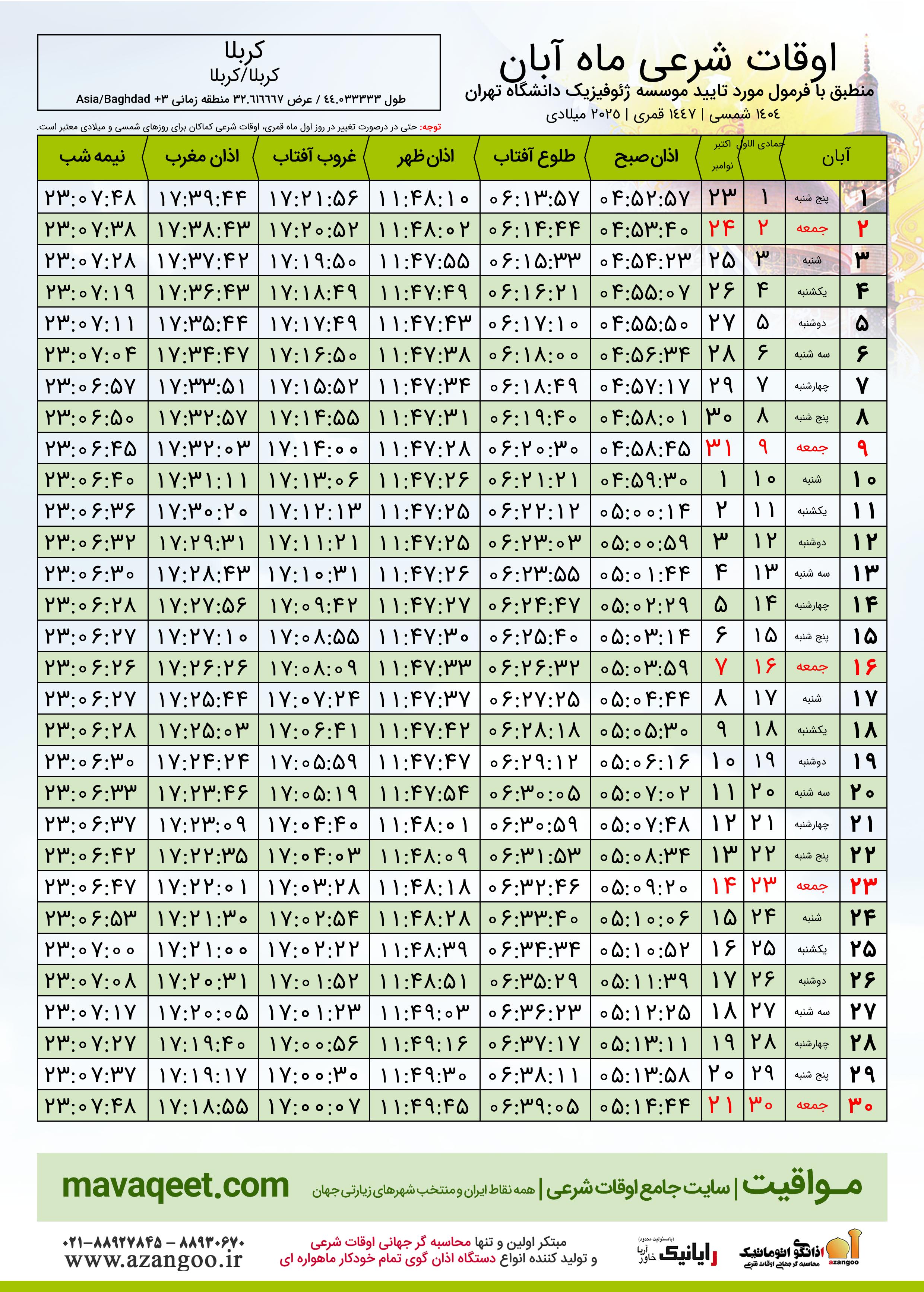 اوقات شرعی آبان ١٤٠٤ شمسی شهر کربلا