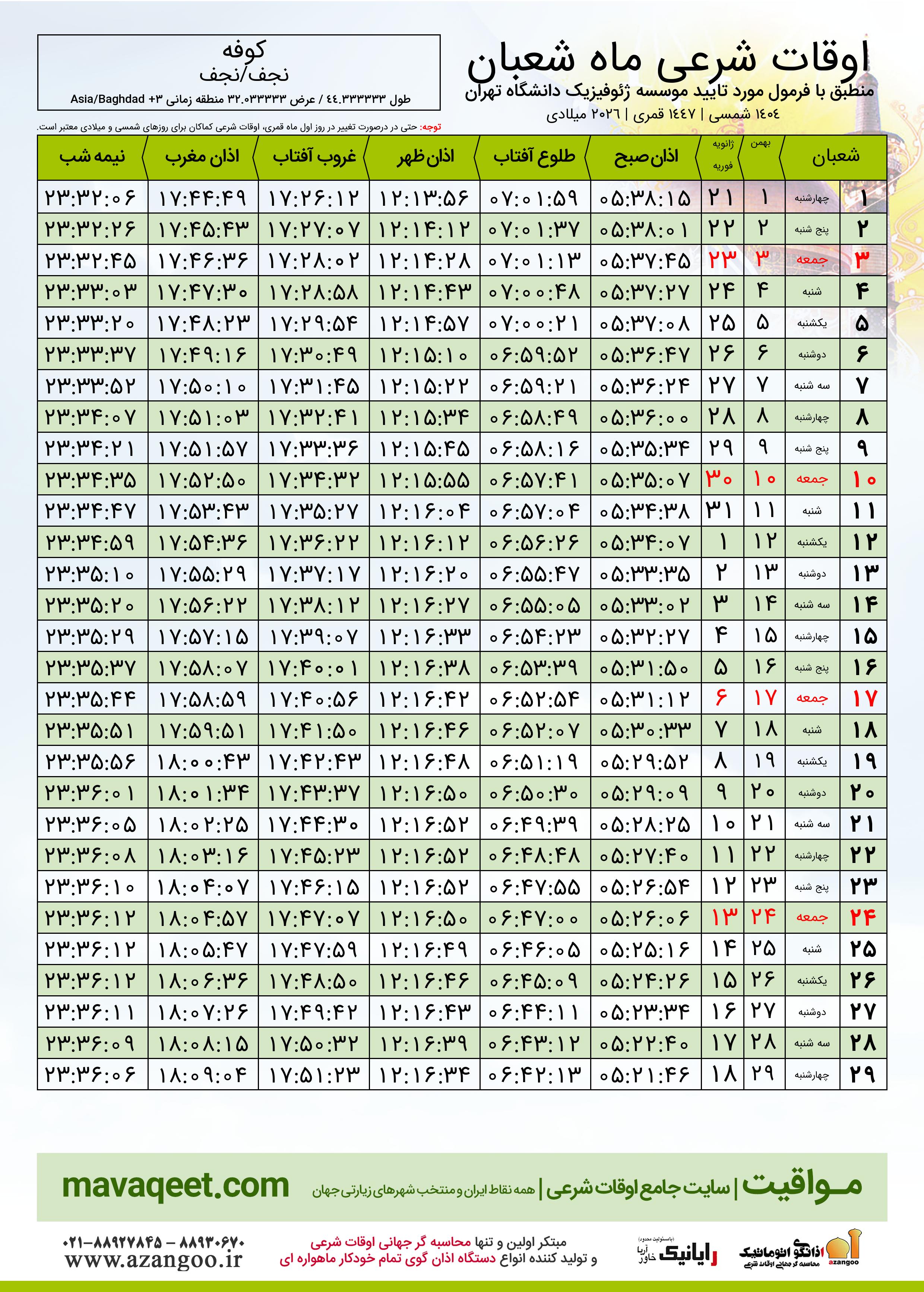 اوقات شرعی ماه شعبان ١٤٤٧ هـ.ق شهر کوفه بر