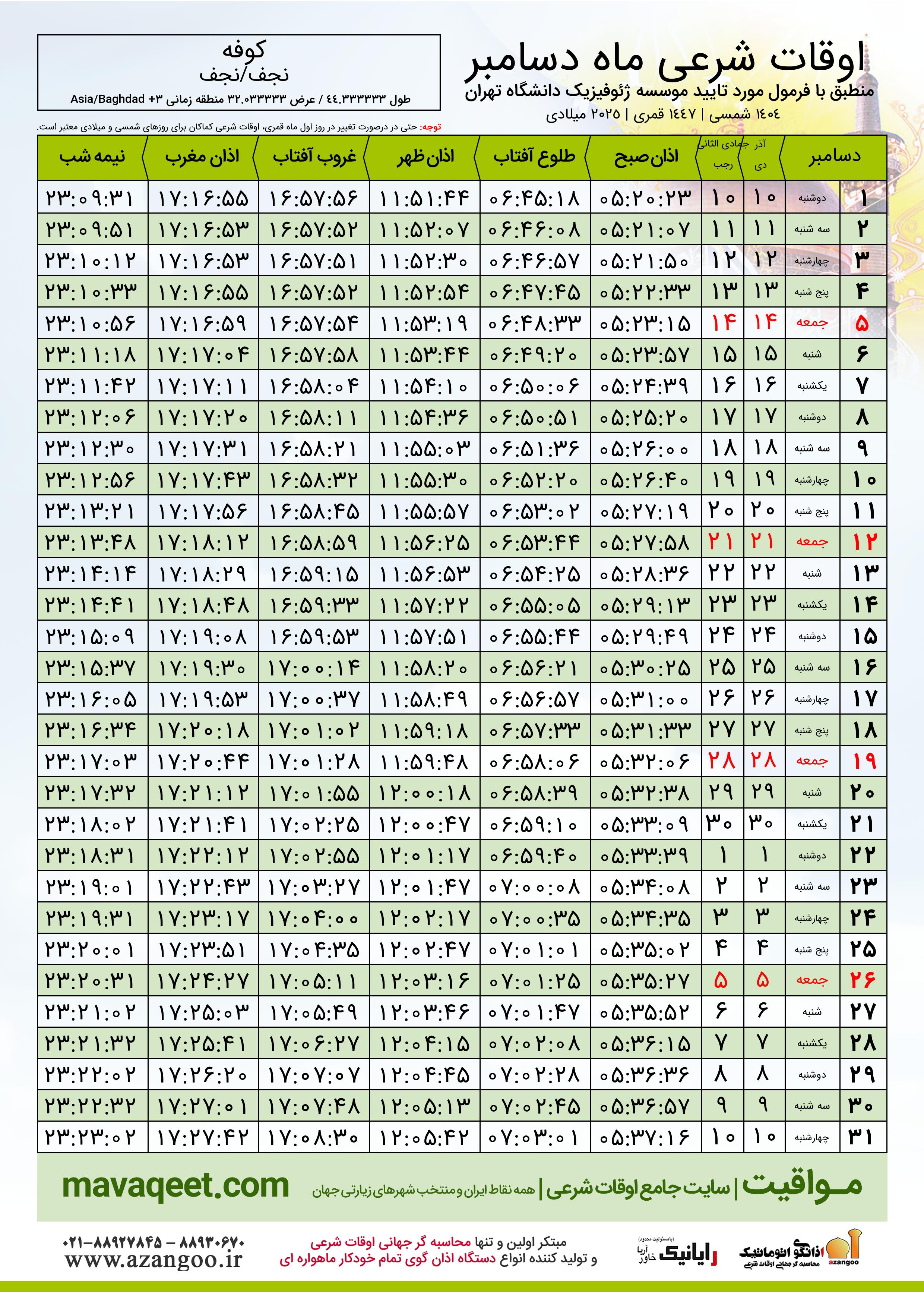 جدول اوقات شرعی دسامبر ٢٠٢٥ میلادی شهر کوفه
