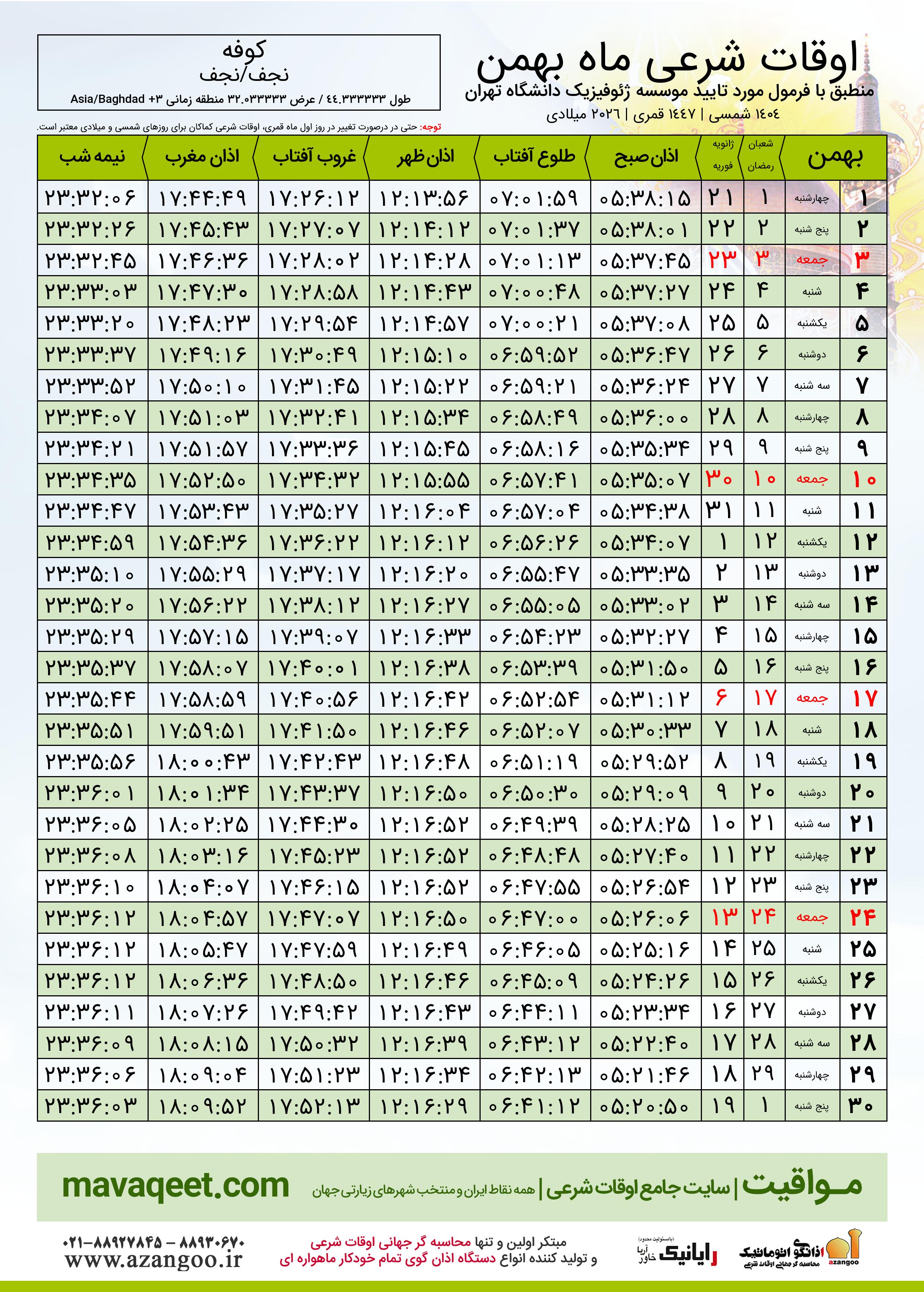 دانلود اوقات شرعی بهمن ٠٤ - ١٤٠٤ شهر کوفه