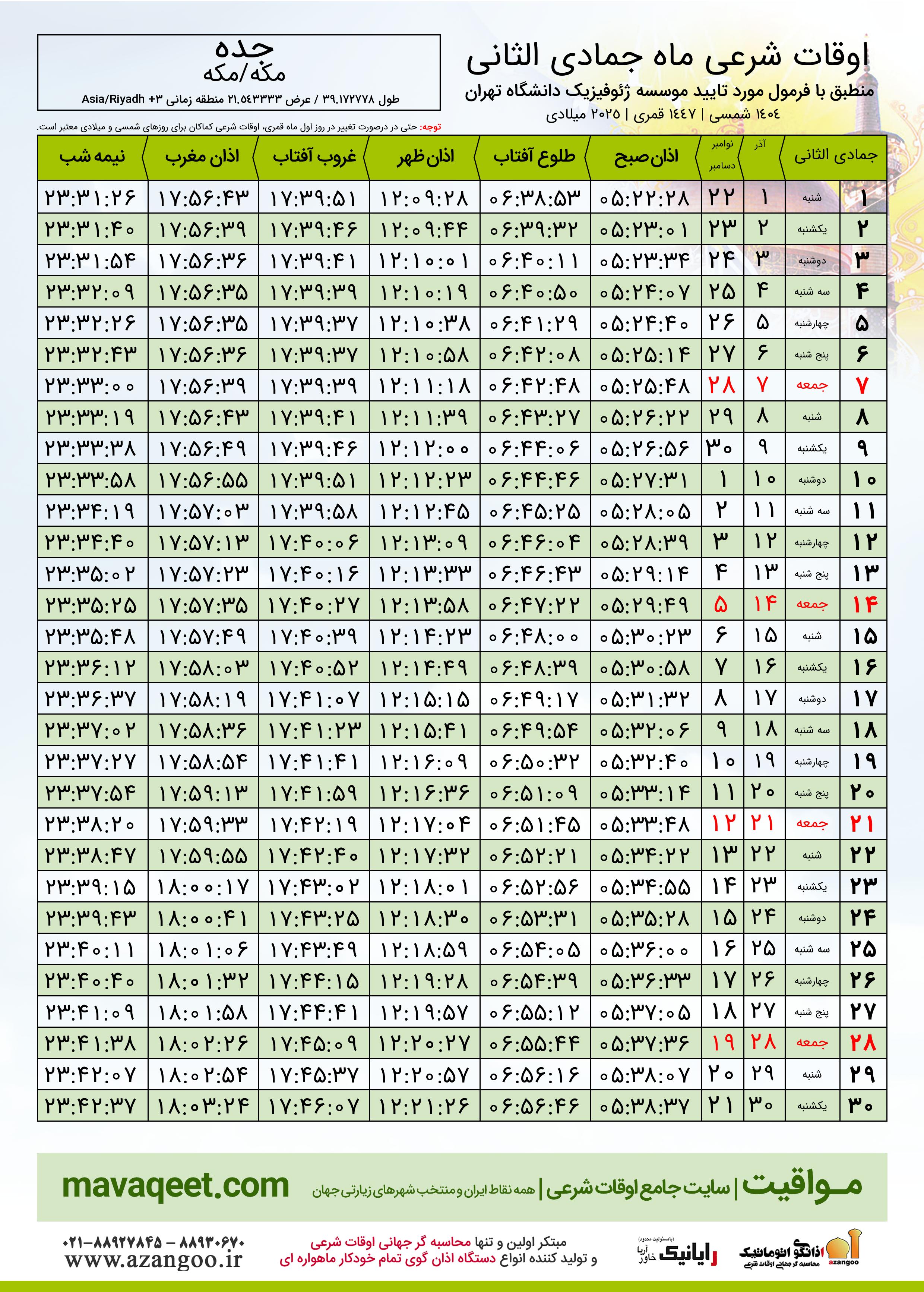 جدول اوقات شرعی آذر ١٤٠٤ شمسی شهر جده