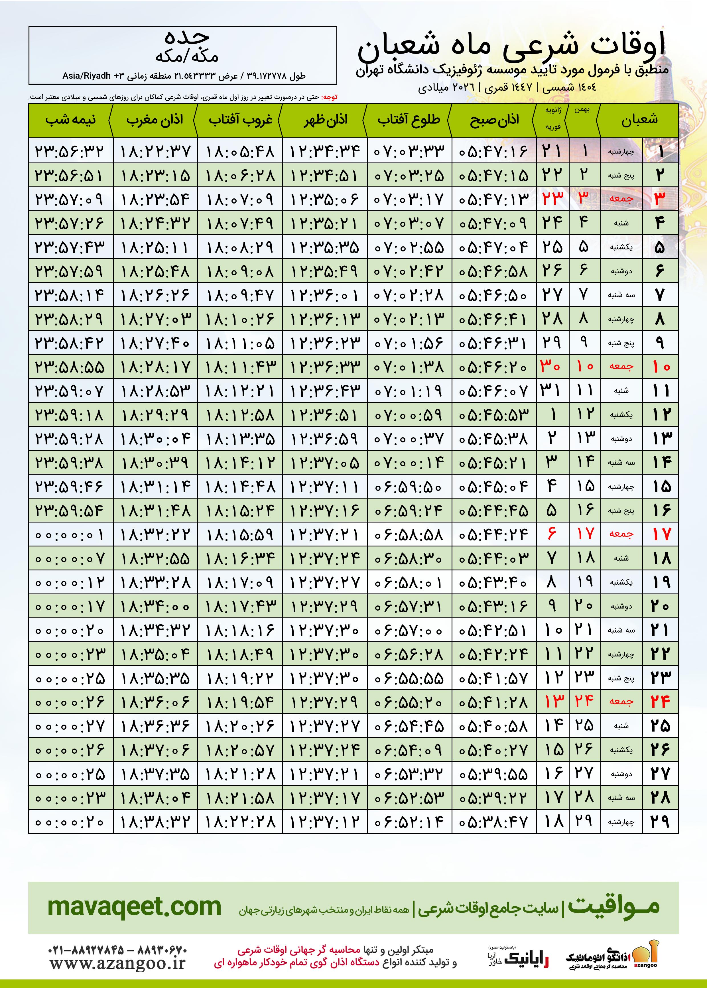 اوقات شرعی ماه شعبان ١٤٤٧ هـ.ق شهر جده بر