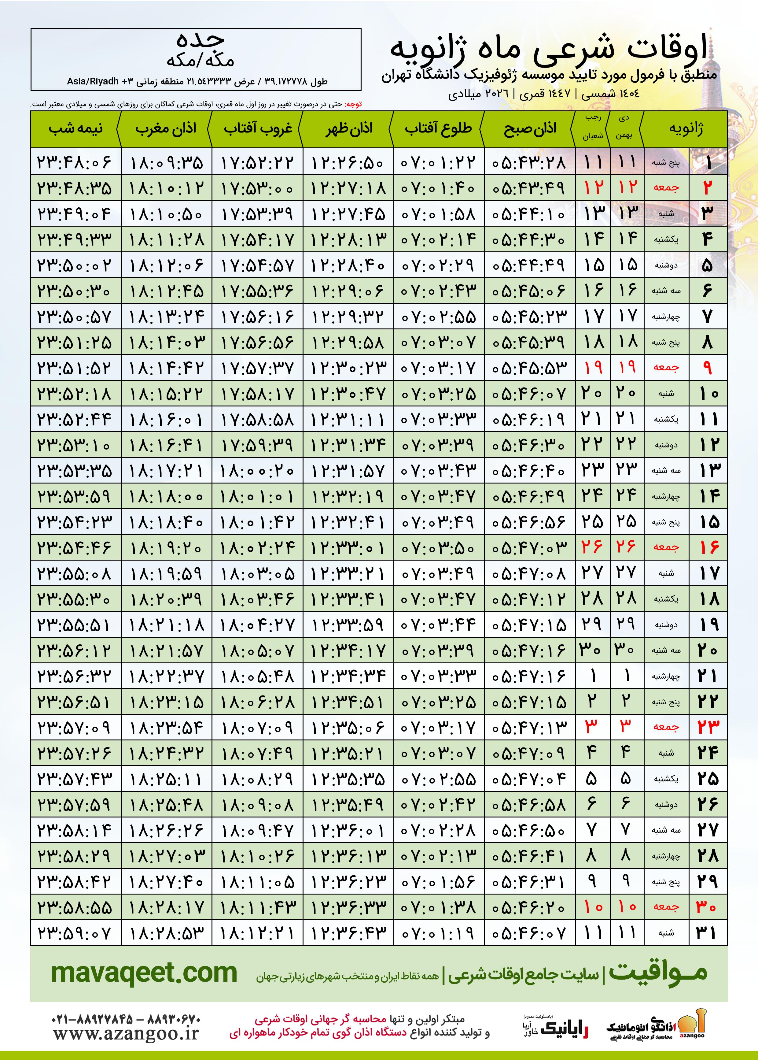 دانلود اوقات شرعی ماه رمضان ٠٤ - ١٤٠٤ شمسی | ٢٠٢٦ میلادی | ١٤٤٧ قمری شهر جده