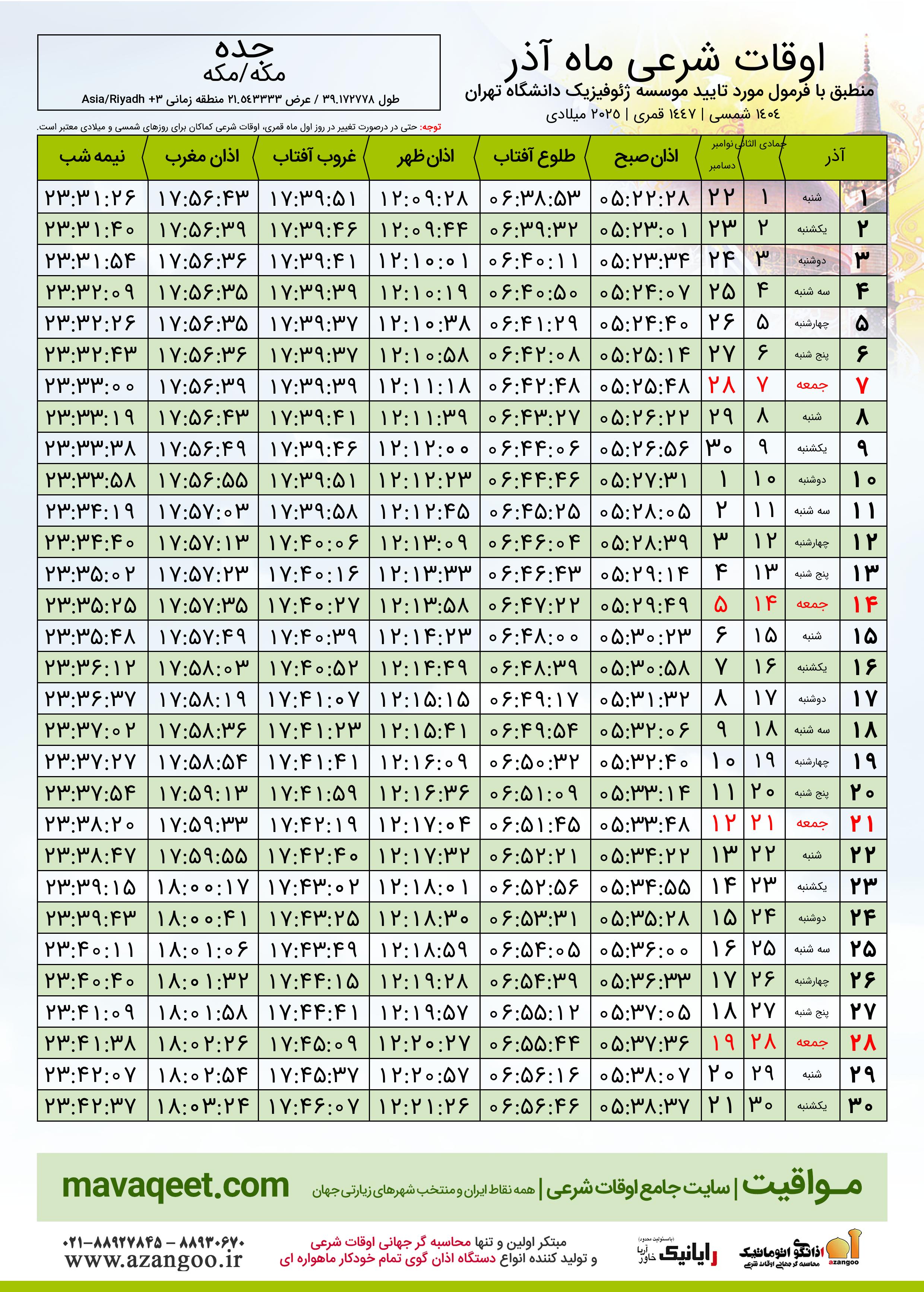 اوقات شرعی آذر ١٤٠٤ شمسی شهر جده