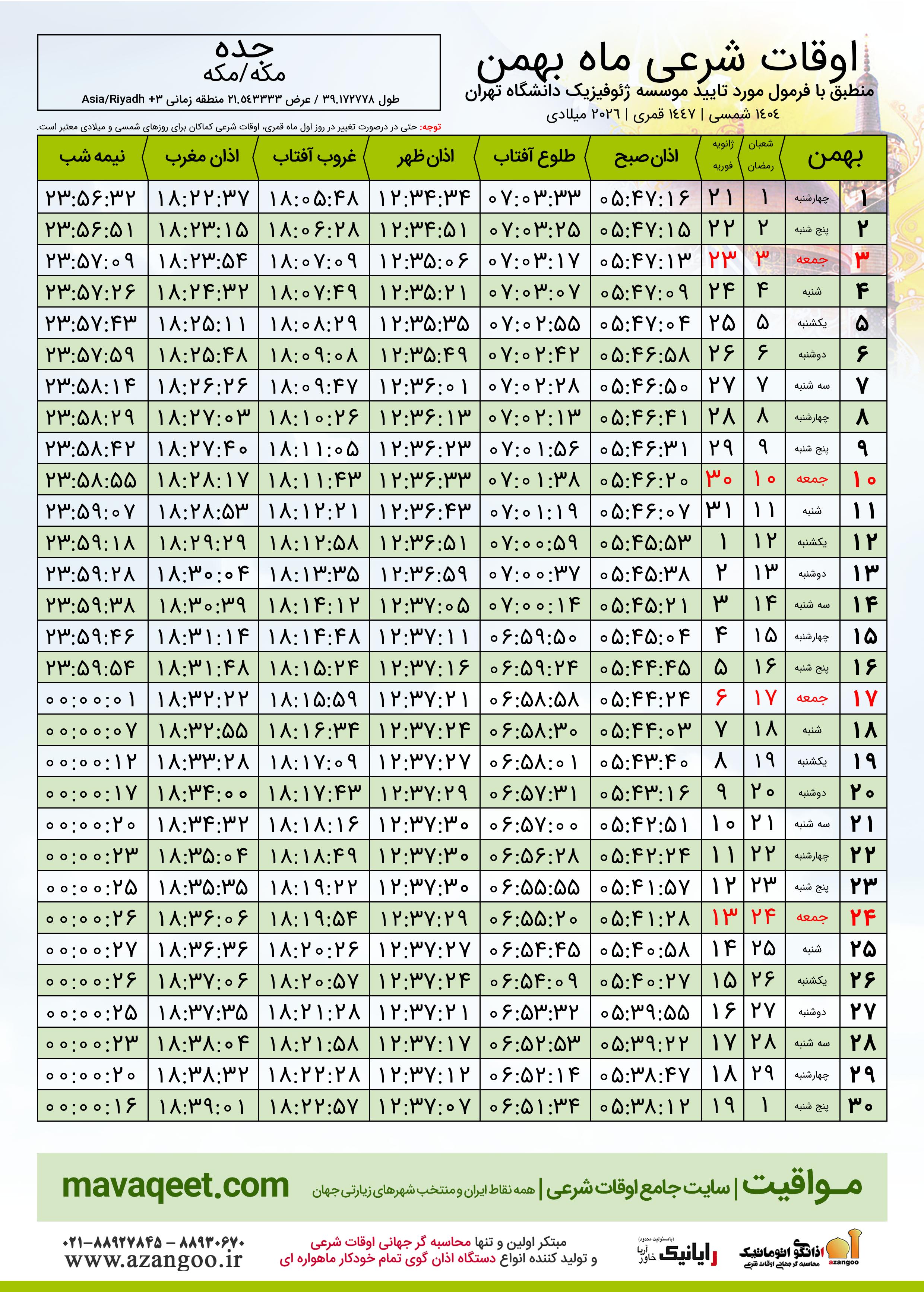 دانلود اوقات شرعی بهمن ٠٤ - ١٤٠٤ شهر جده