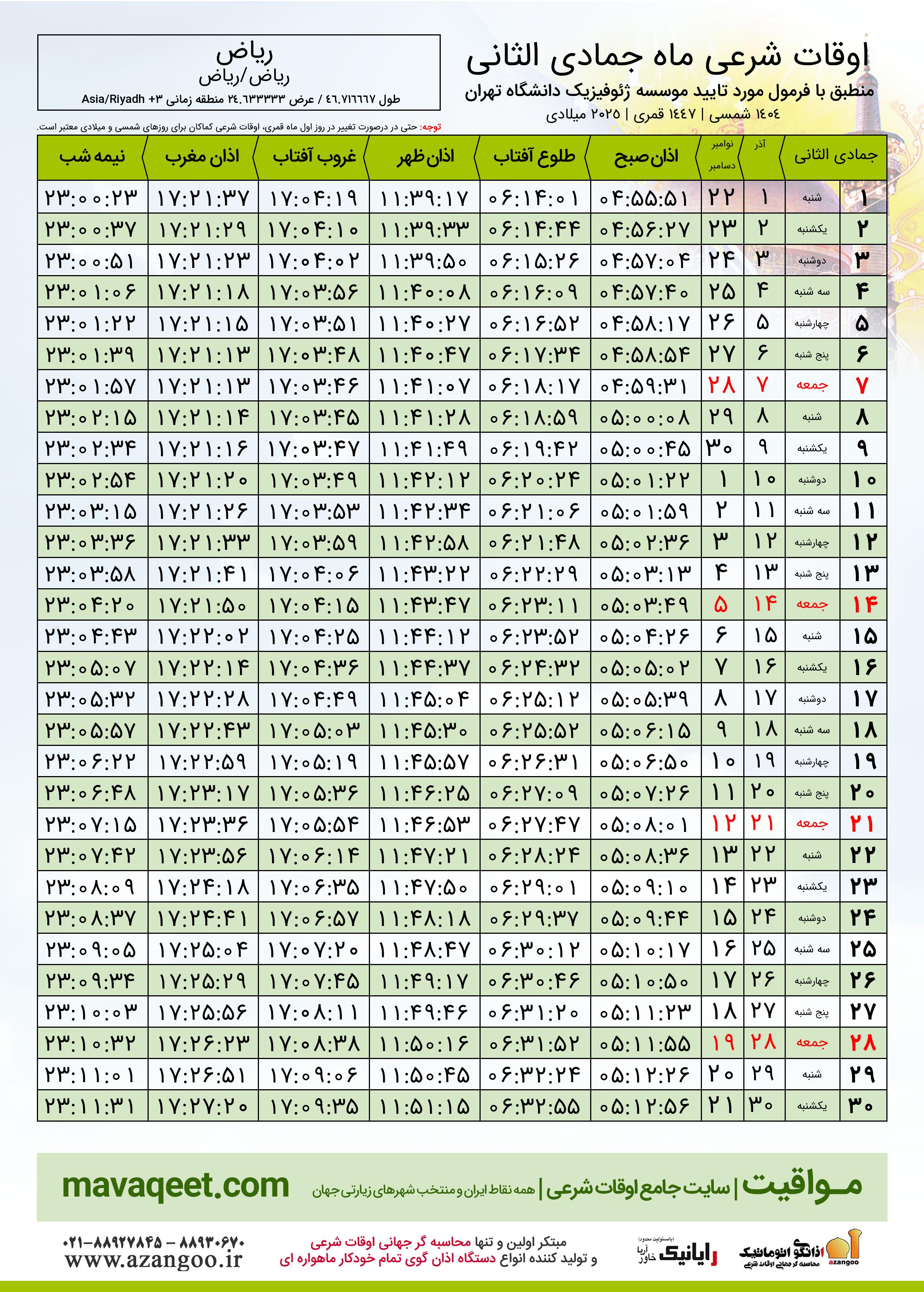 جهت استفاده آن دسته از افرادی که نیاز به اوقات شرعی بر اساس ماه های قمری را دارند؛ اوقات شرعی جمادی الثانی ١٤٤٧ هـ.ق برابر با هـ.ش شهر ریاض قابل مشاهده و دانلود می باشد. همچنین می توانید ماه های دیگر قمری را انتخاب نموده و فایل اوقات شرعی مربوطه را برای شهر ریاض دانلود نمایید.
