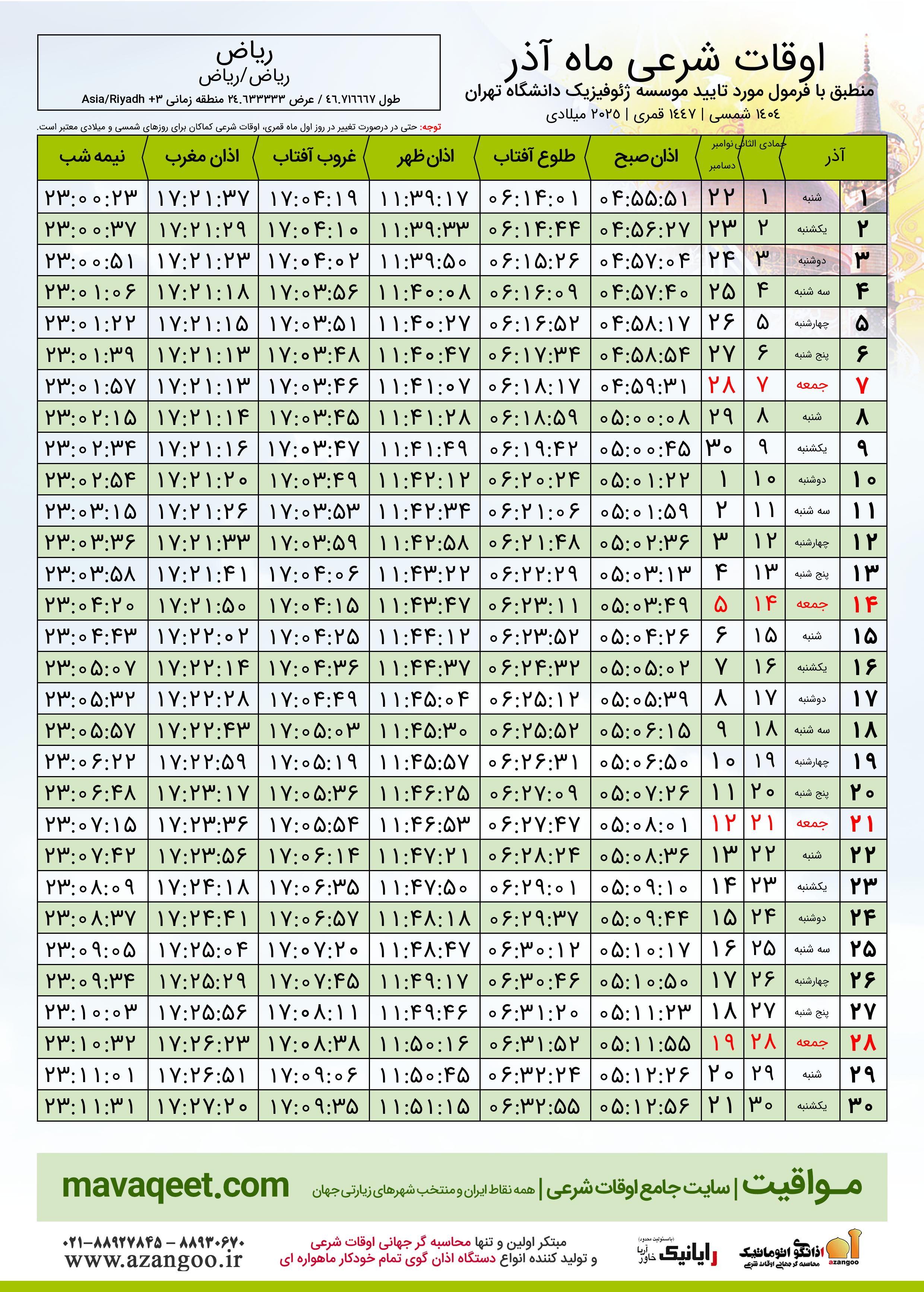 اوقات شرعی آذر ١٤٠٤ شمسی شهر ریاض