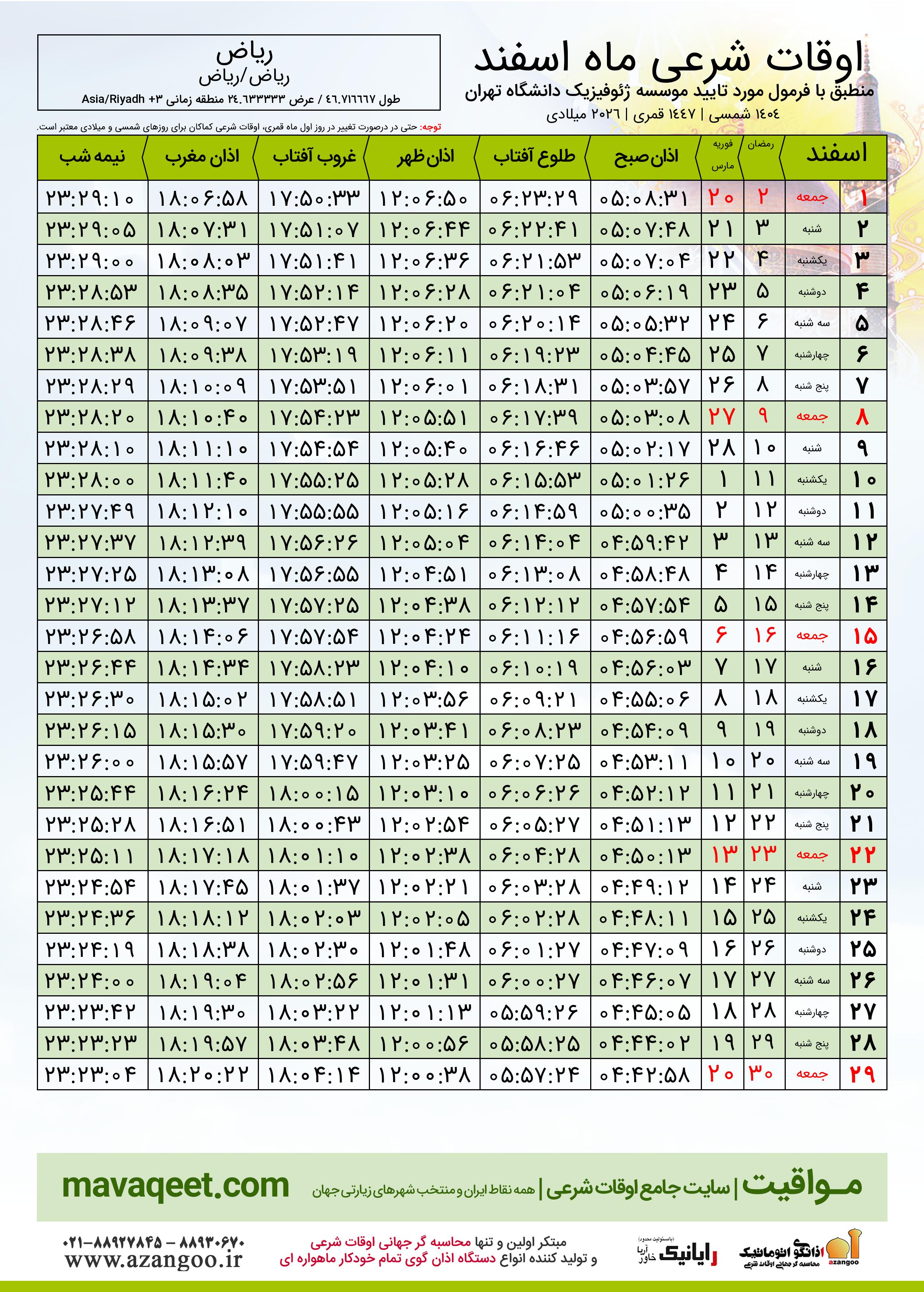 اوقات شرعی اسفند ١٤٠٤ شمسی شهر ریاض
