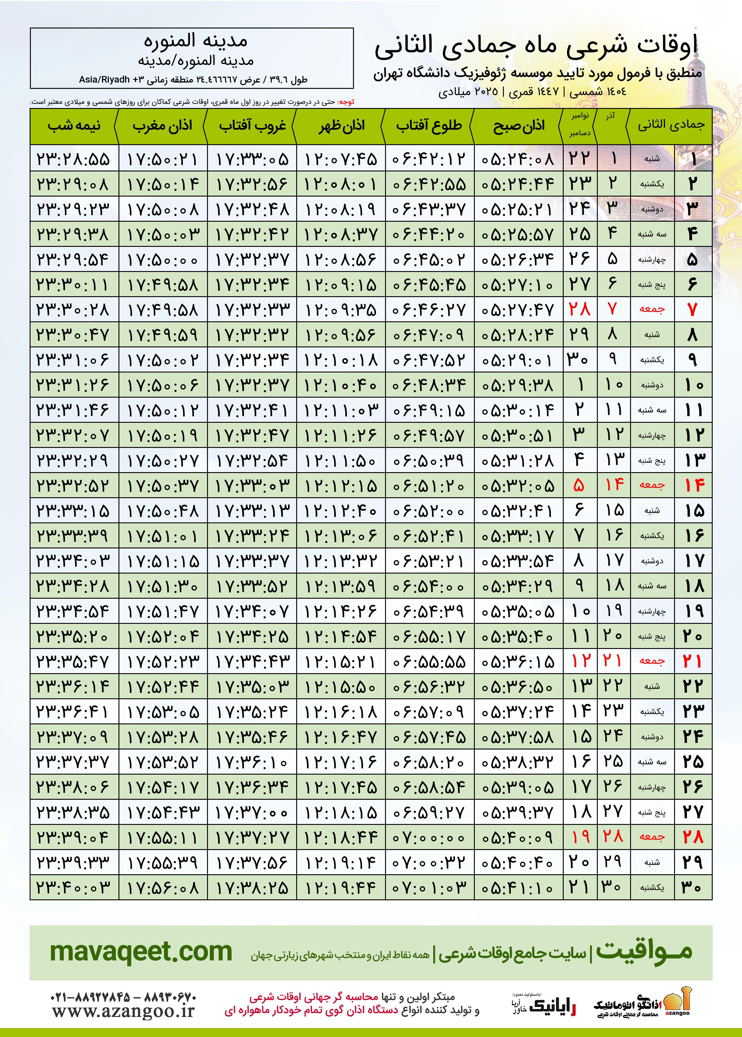 جهت نمایش تصویر جدول اوقات شرعی ماه جمادی الثانی ١٤٤٧ هـ.ق شهر مدینه المنوره در اندازه