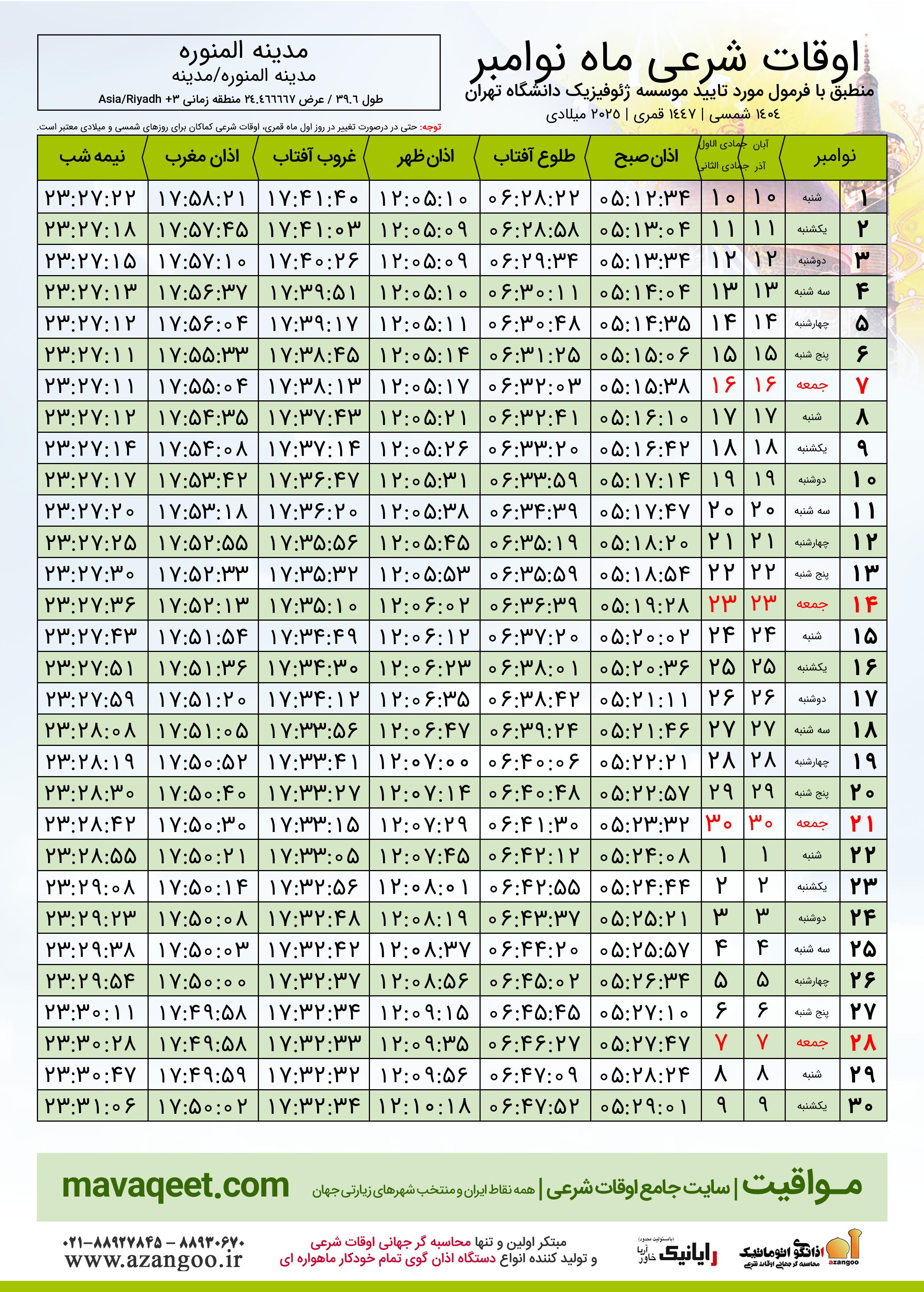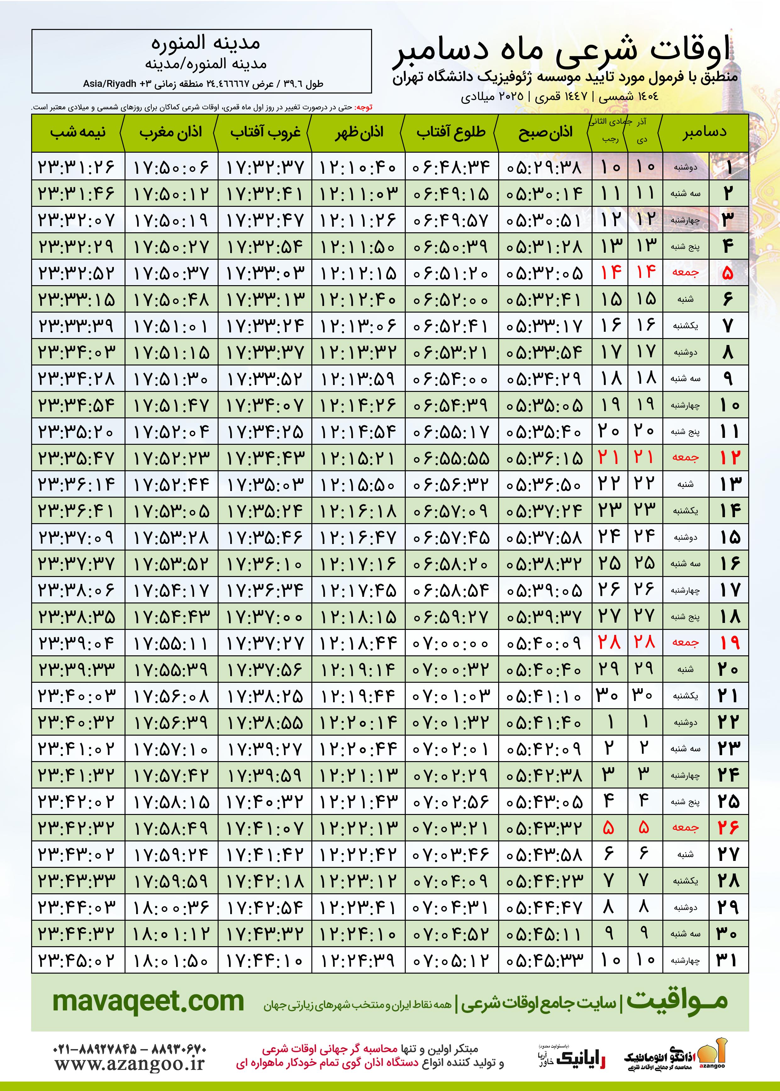 دانلود اوقات شرعی ماه رمضان ٠٤ - ١٤٠٤ شمسی | ٢٠٢٦ میلادی | ١٤٤٧ قمری شهر مدینه المنوره