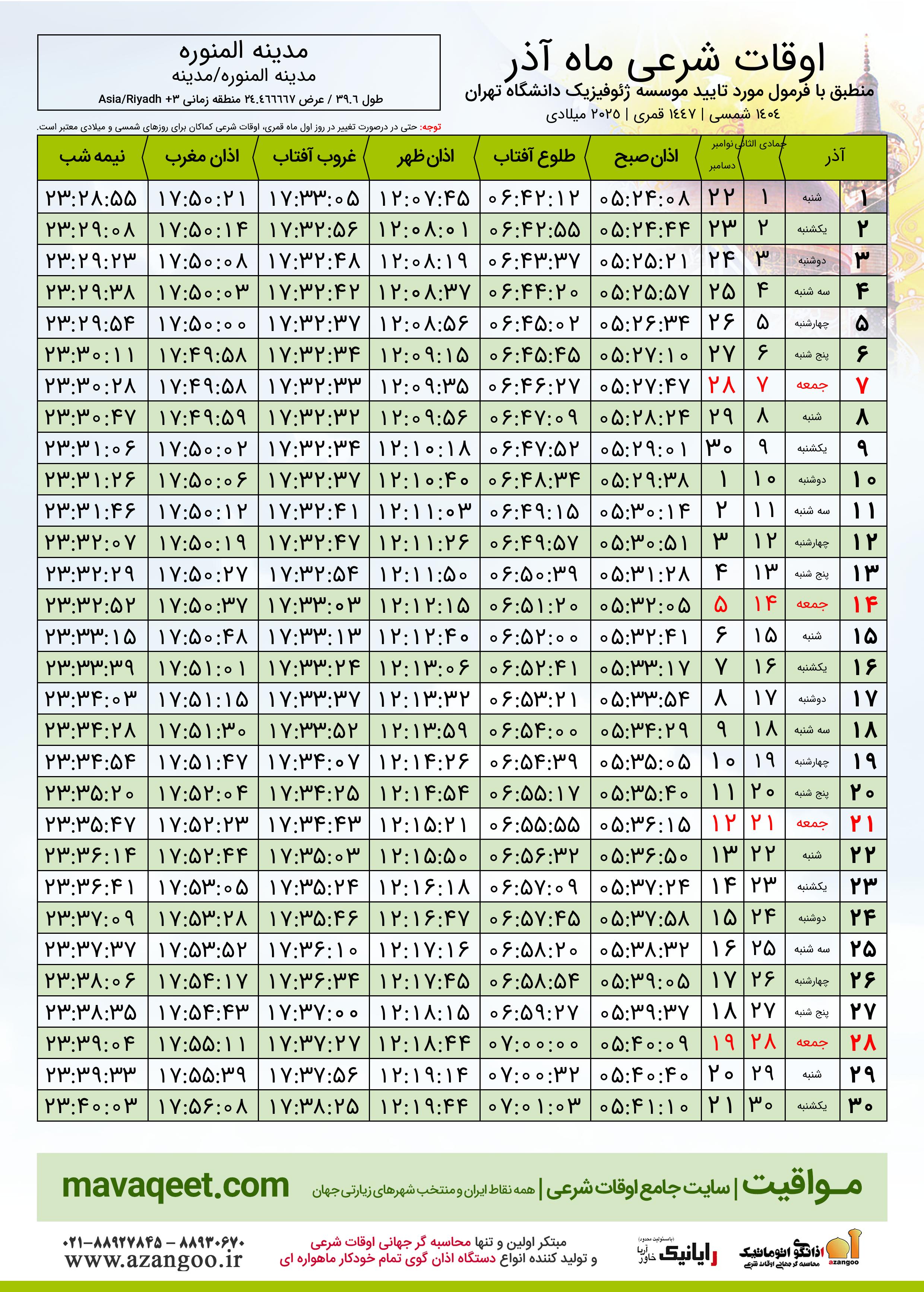 اوقات شرعی آذر ١٤٠٤ شمسی شهر مدینه المنوره