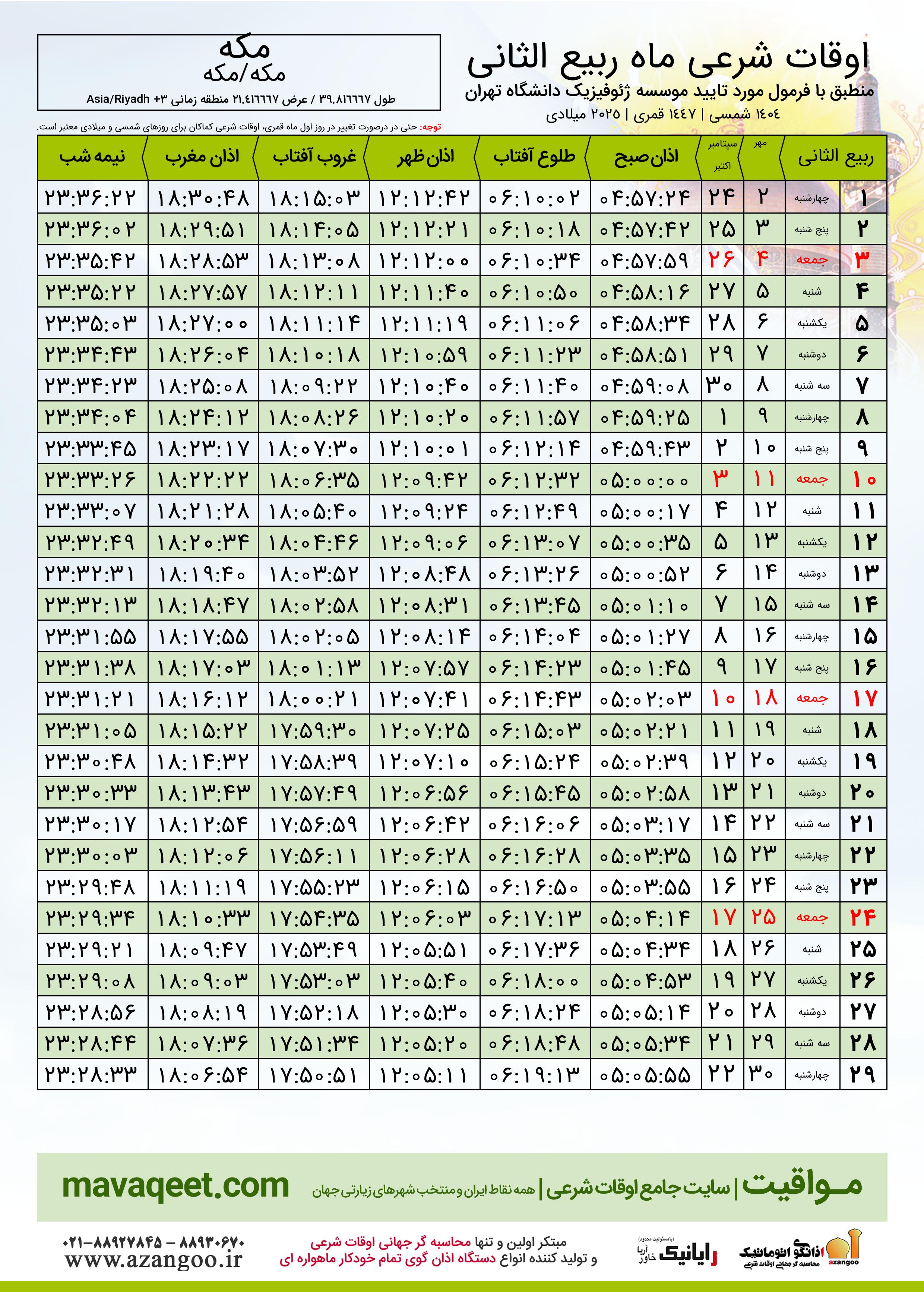 اوقات شرعی ماه ربیع الثانی ١٤٤٧ هـ.ق شهر مکه بر