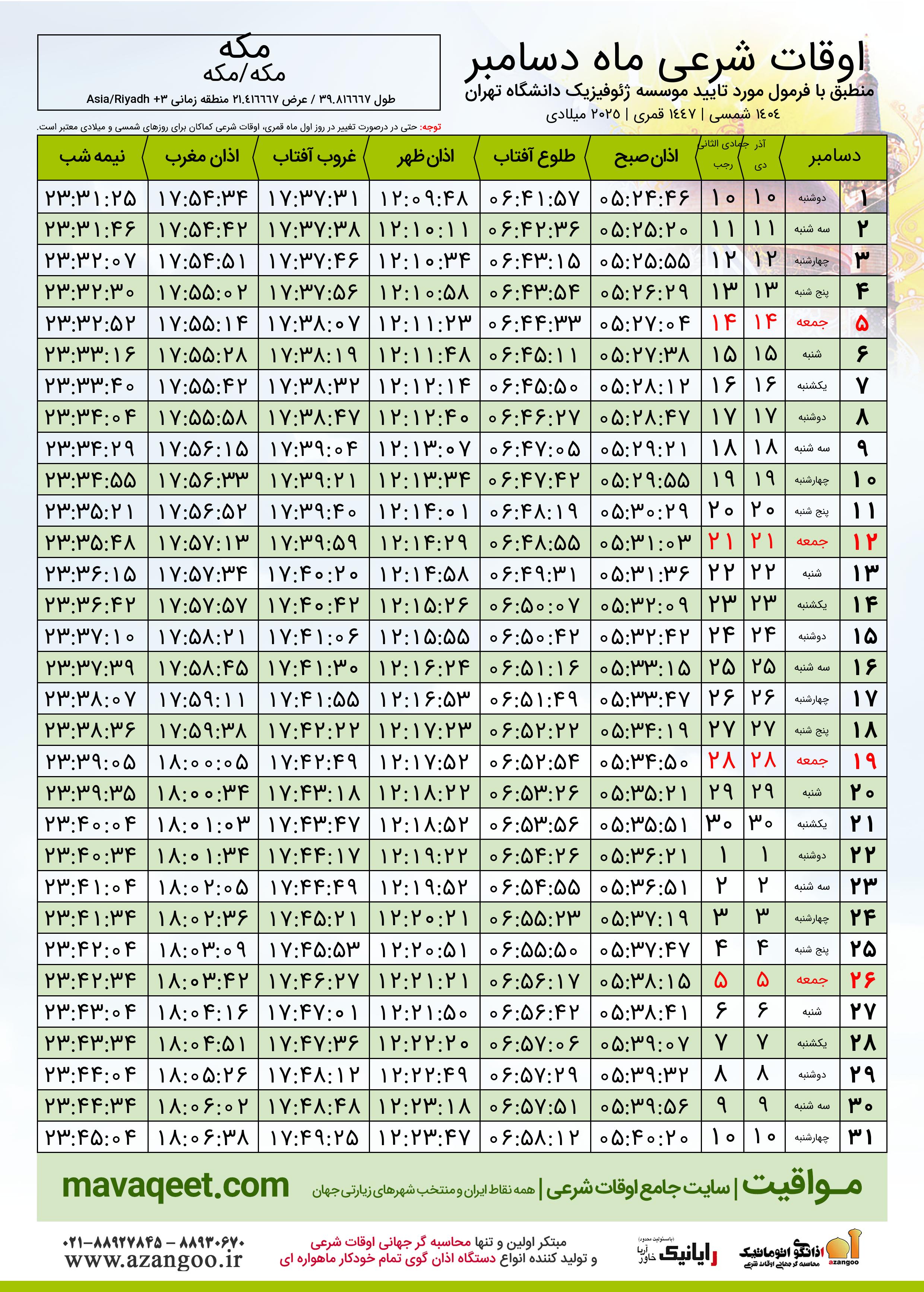 جدول اوقات شرعی آذر ١٤٠٤ شمسی شهر مکه