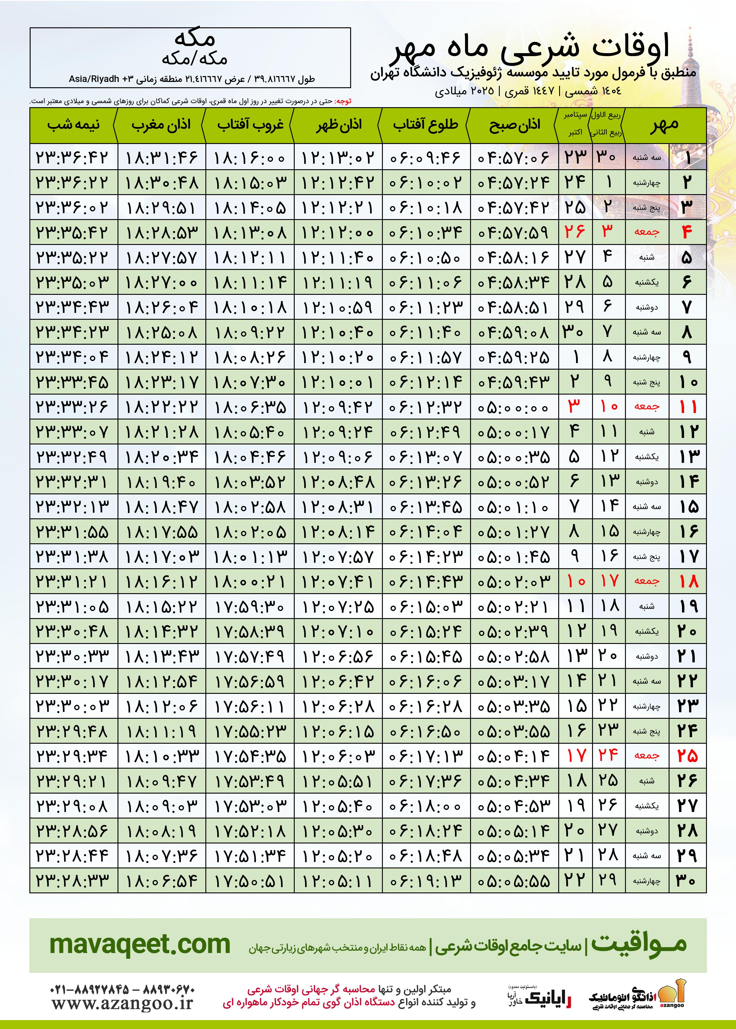 جدول اوقات شرعی مهر ١٤٠٤ شمسی شهر مکه