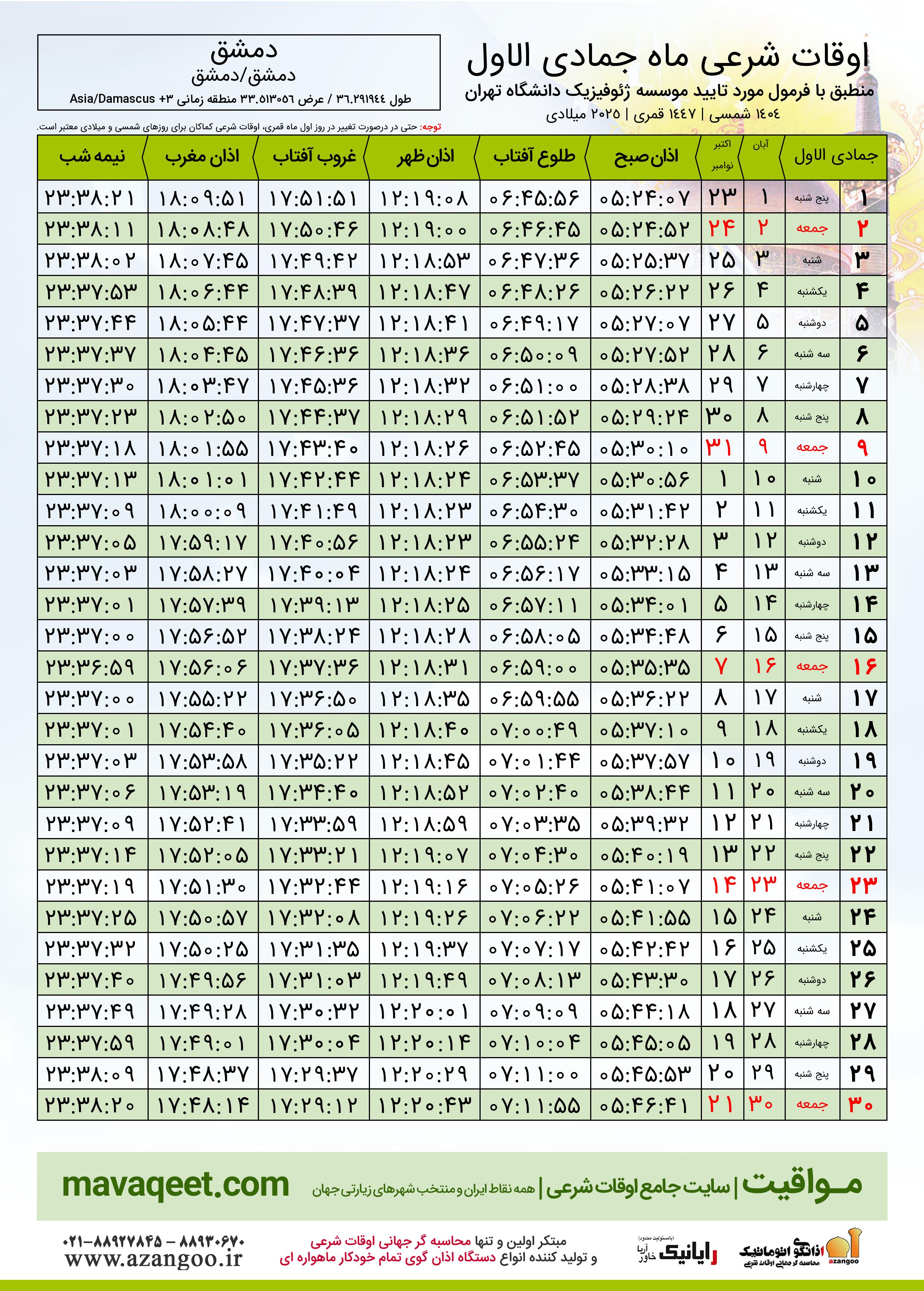 جدول اوقات شرعی جمادی الاول ١٤٤٧ قمری شهر دمشق