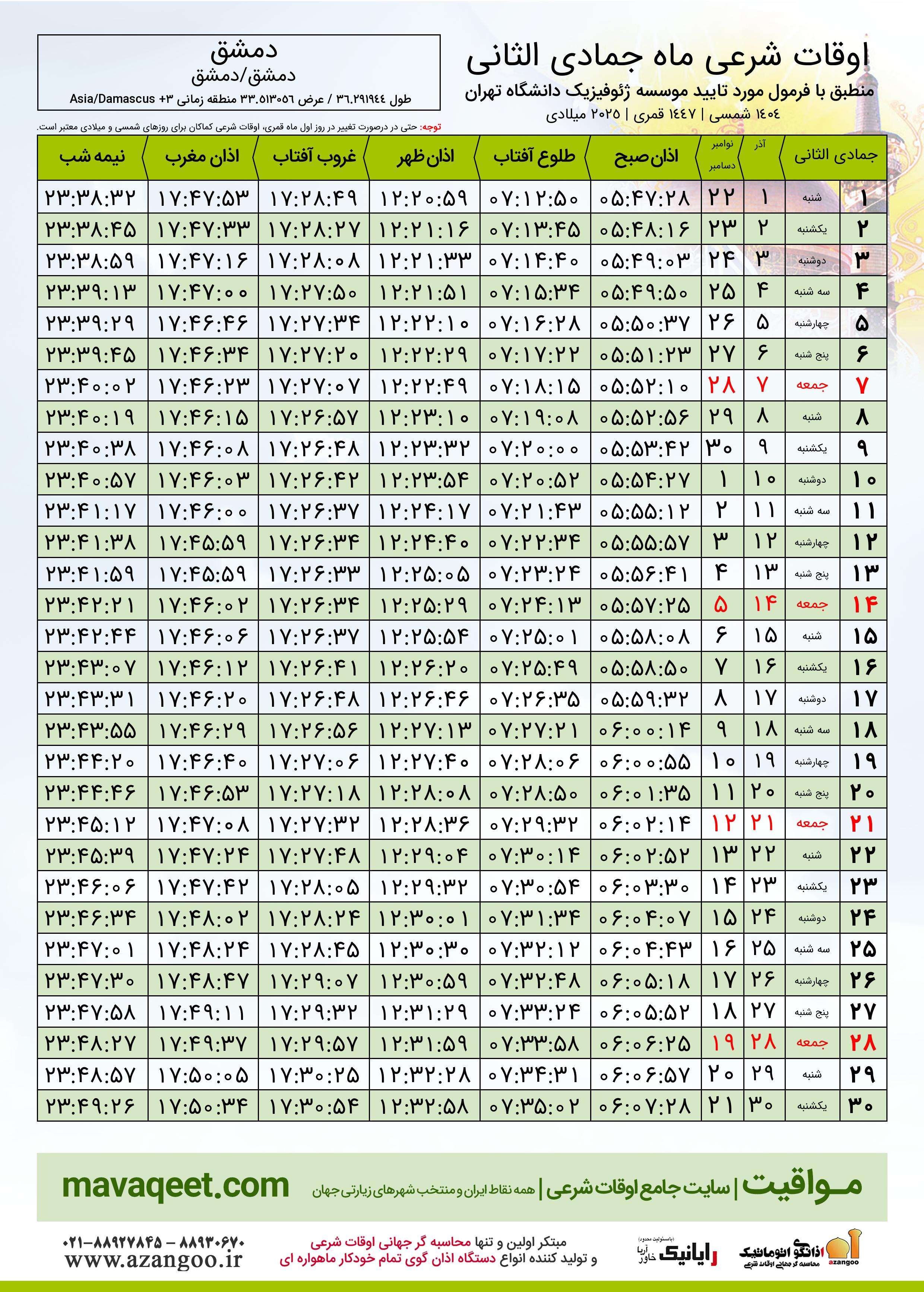 اوقات شرعی ماه جمادی الثانی ١٤٤٧ هـ.ق شهر دمشق بر