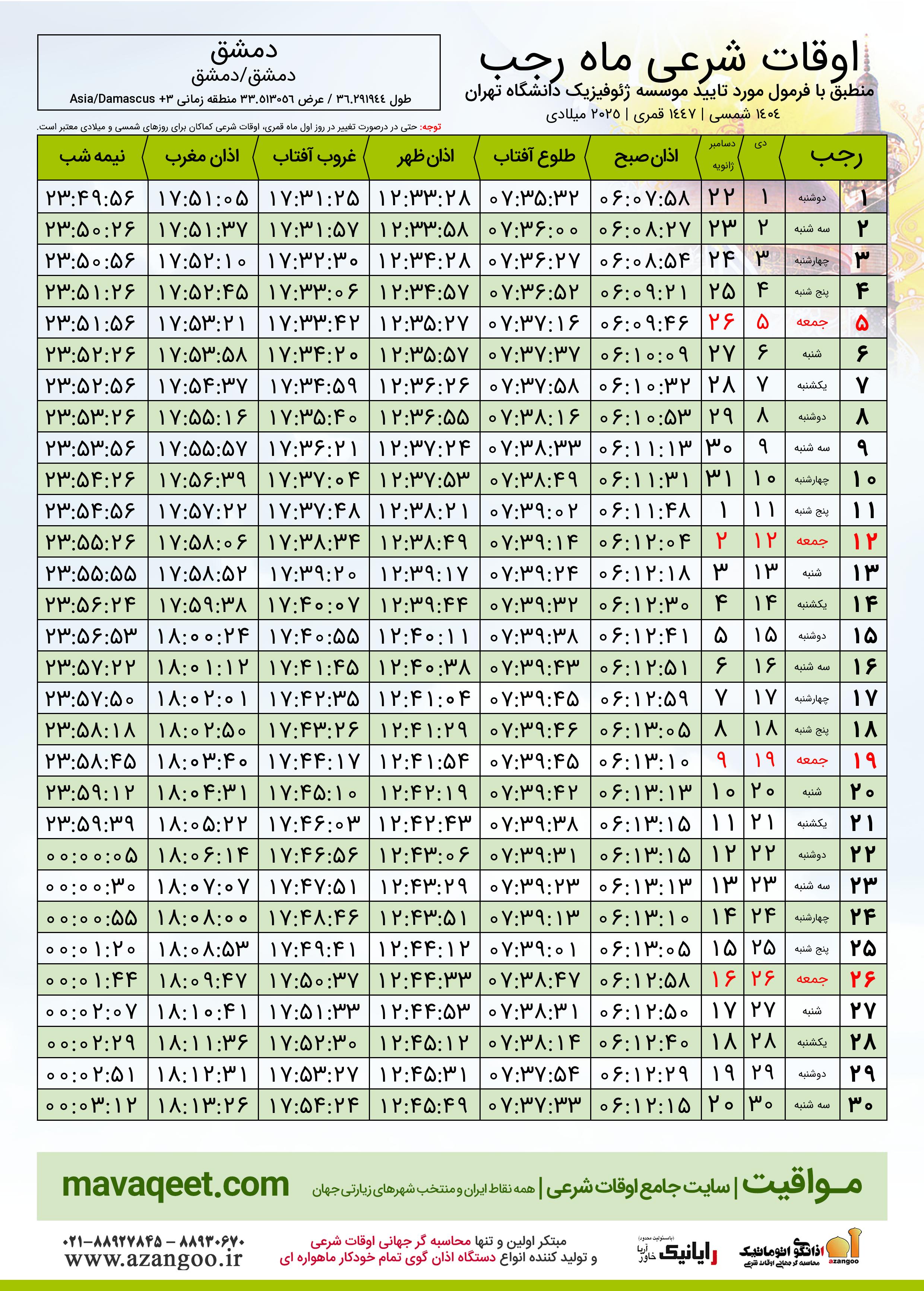 جدول اوقات شرعی رجب ١٤٤٧ قمری شهر دمشق