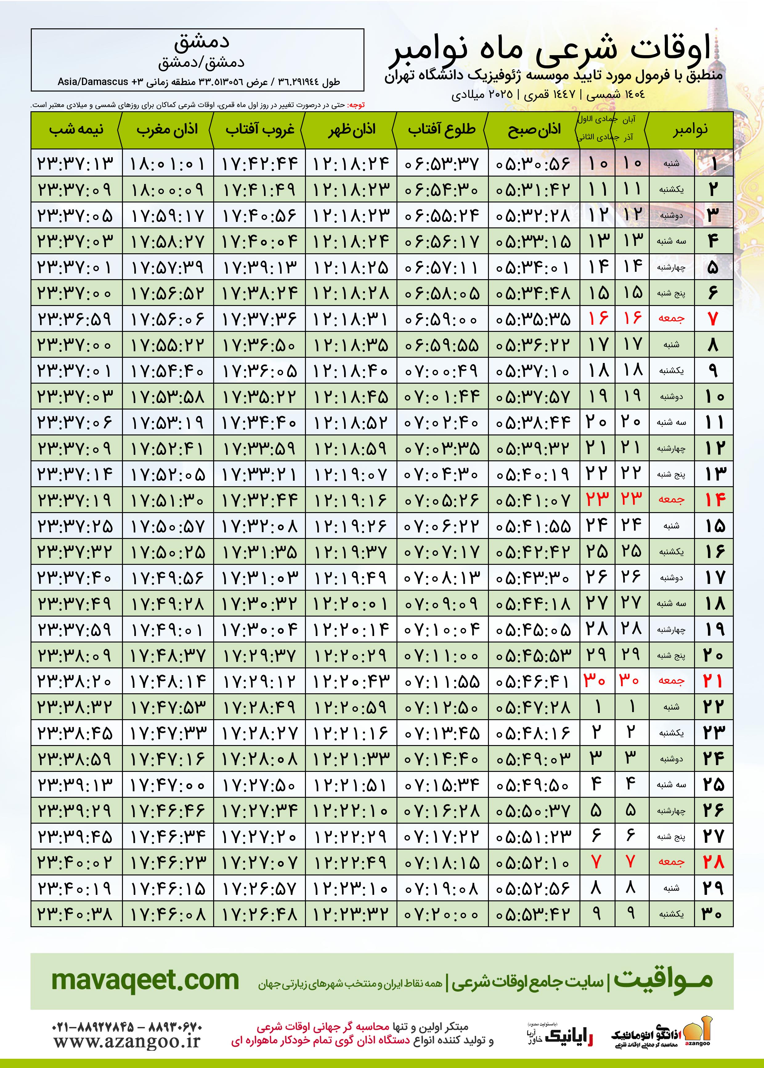 دانلود اوقات شرعی نوامبر ٢٠٢٥ شهر دمشق