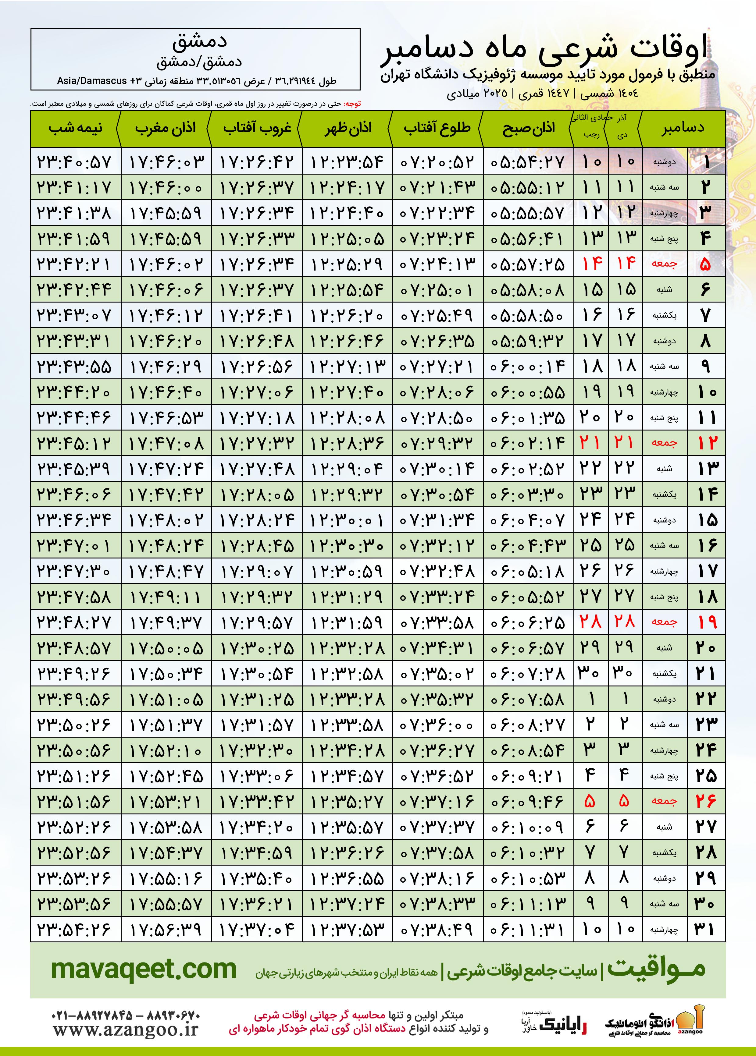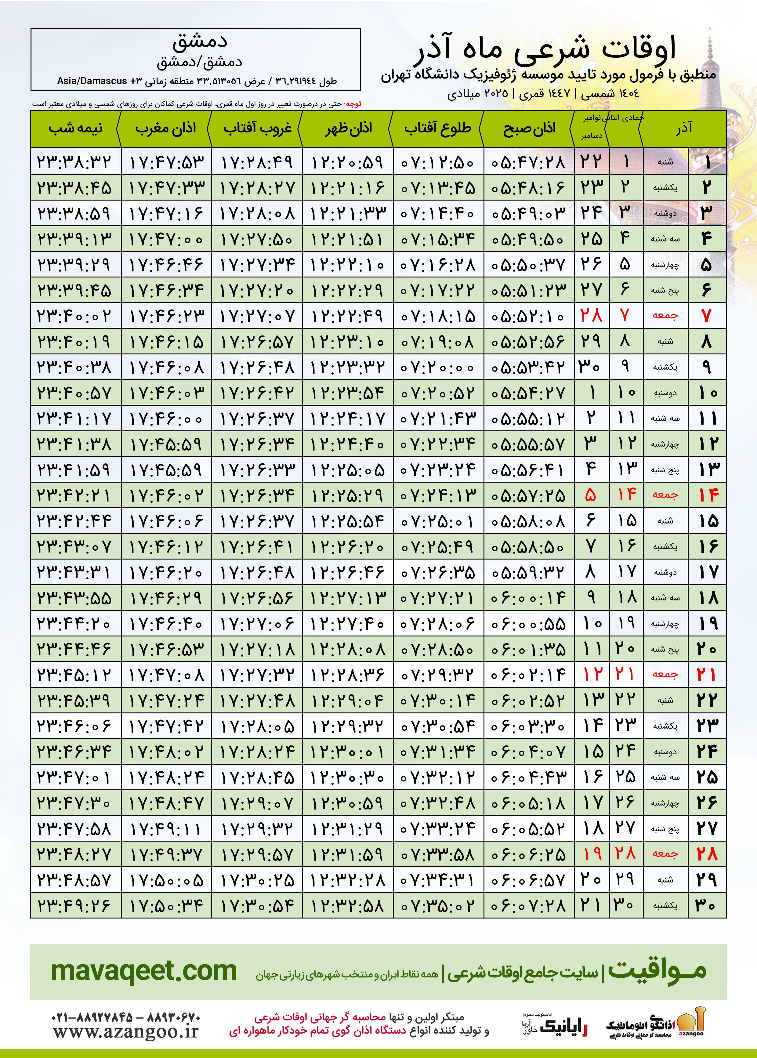 اوقات شرعی آذر ١٤٠٤ شمسی شهر دمشق