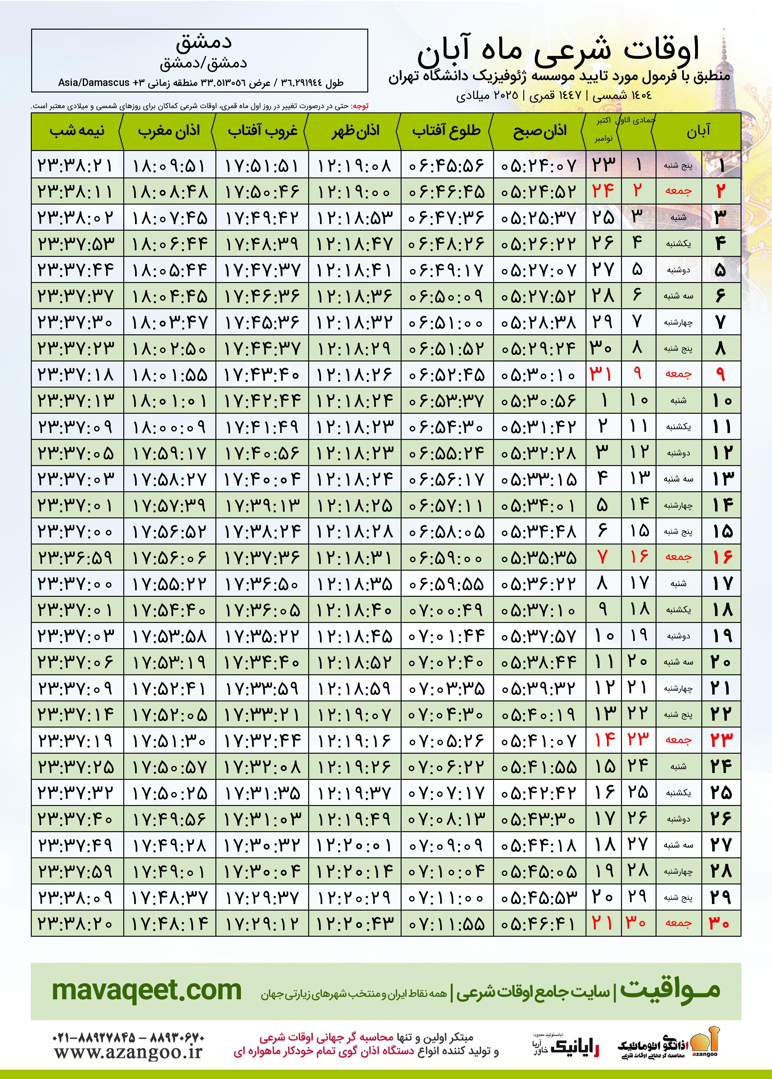 اوقات شرعی آبان ١٤٠٤ شمسی شهر دمشق