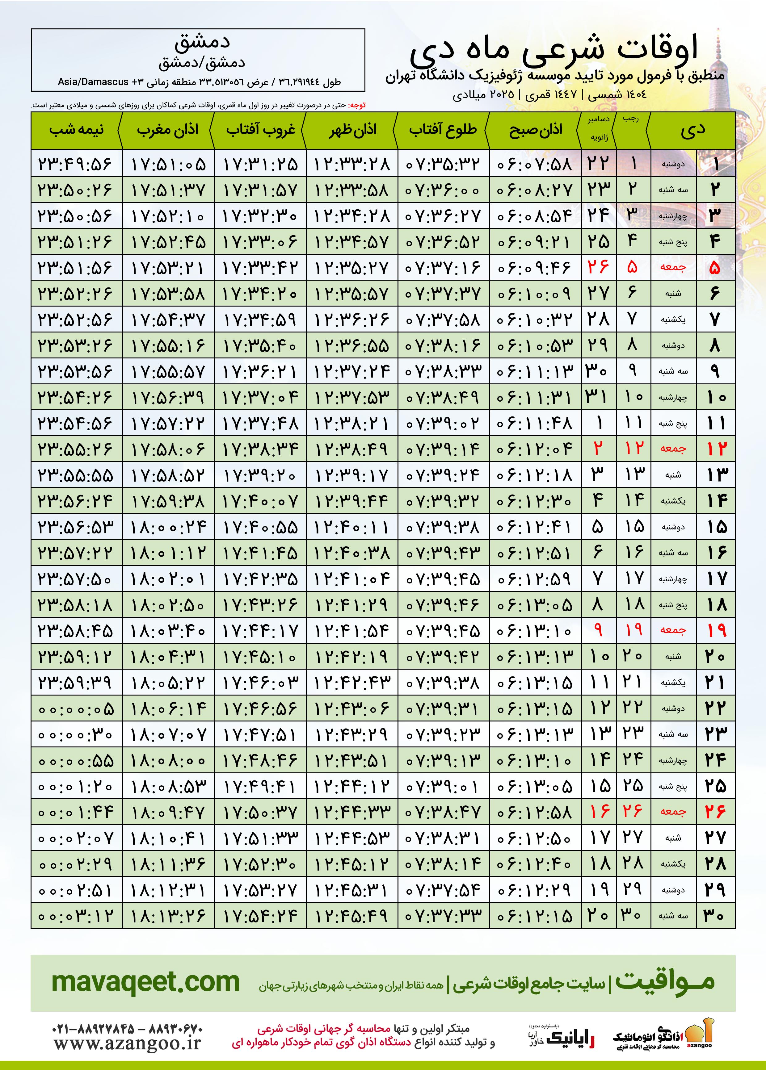 دانلود اوقات شرعی دی ٠٤ - ١٤٠٤ شهر دمشق
